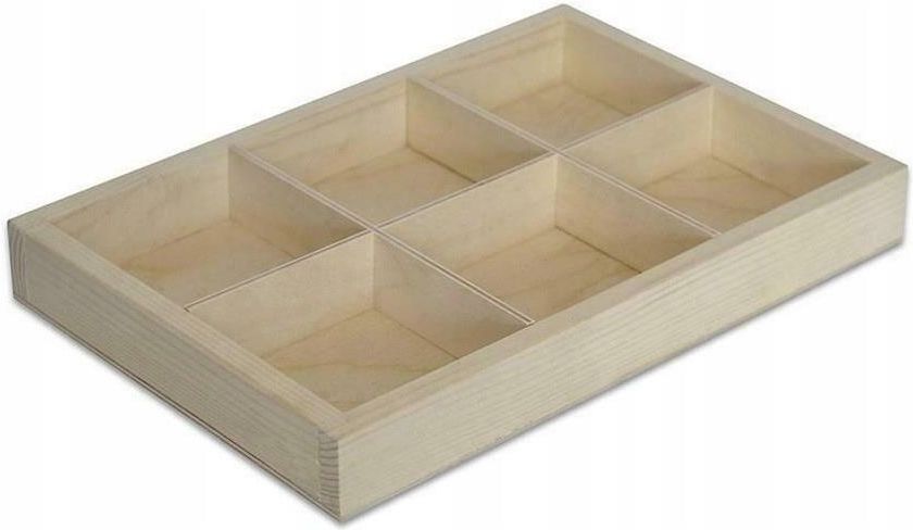 Drewniany organizer z przegródkami. Wykonany ze sklejki o grubości 12mm, solidny. Wymiary: 27,5cm x 18cm x4cm Wymiary przegródek: 8cm x 8cm x 3,5cm Ilość przegródek: 6 Produkt bezpośrednio od producenta.