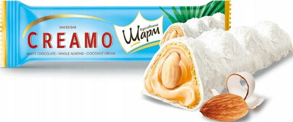 ABK Wafelek Creamo z nadzieniem o smaku kokosowo-migdałowym 29 g Producent: AIM FOOD Kod kreskowy: 4823105816774 Waga jednostkowa brutto: 0.029 kg Wafelek wypełniony nadzieniem kokosowym (39%) z całymi migdałami w polewie o smaku białej czekolady (34%). Wartość energetyczna: 2390 kJ/ 570 kcal …