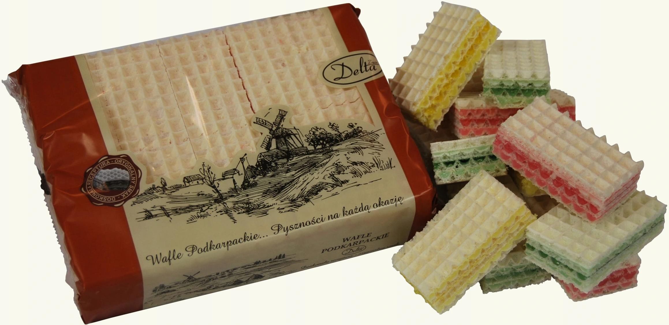 Tradycyjne wafle podkarpackie przekładane galaretką i masą o smaku owocowym. Opakowanie 450g zawiera 20 sztuk produktu. Termin ważności deklarowany przez sprzedawcę to 2 miesiące od wyprodukowania, dostarczony towar powinien przy dostawie powinien mieć nie mniej niż ¾ tego okresu (do ok. 6 tygodni).