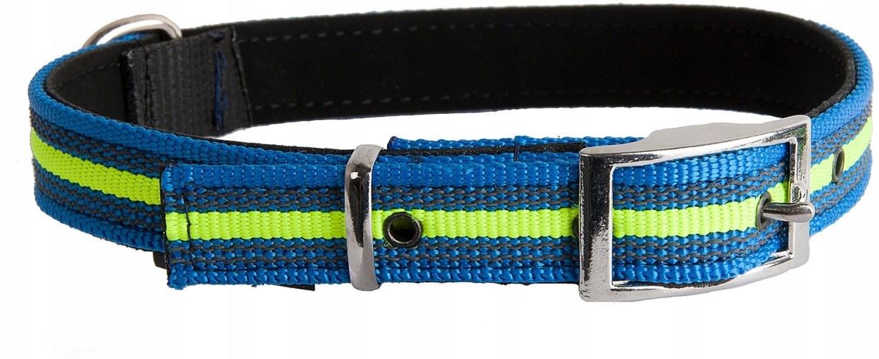 Dino obroża gumowa do budy niebiesko-żółta duża 30mm/75cm Obroża wykonana z solidnego materiału dzięki czemu sprawdza się w swojej roli. Solidna uprząż i klamra. OBROŻA Z TAŚMY GUMOWANA DO BUDY