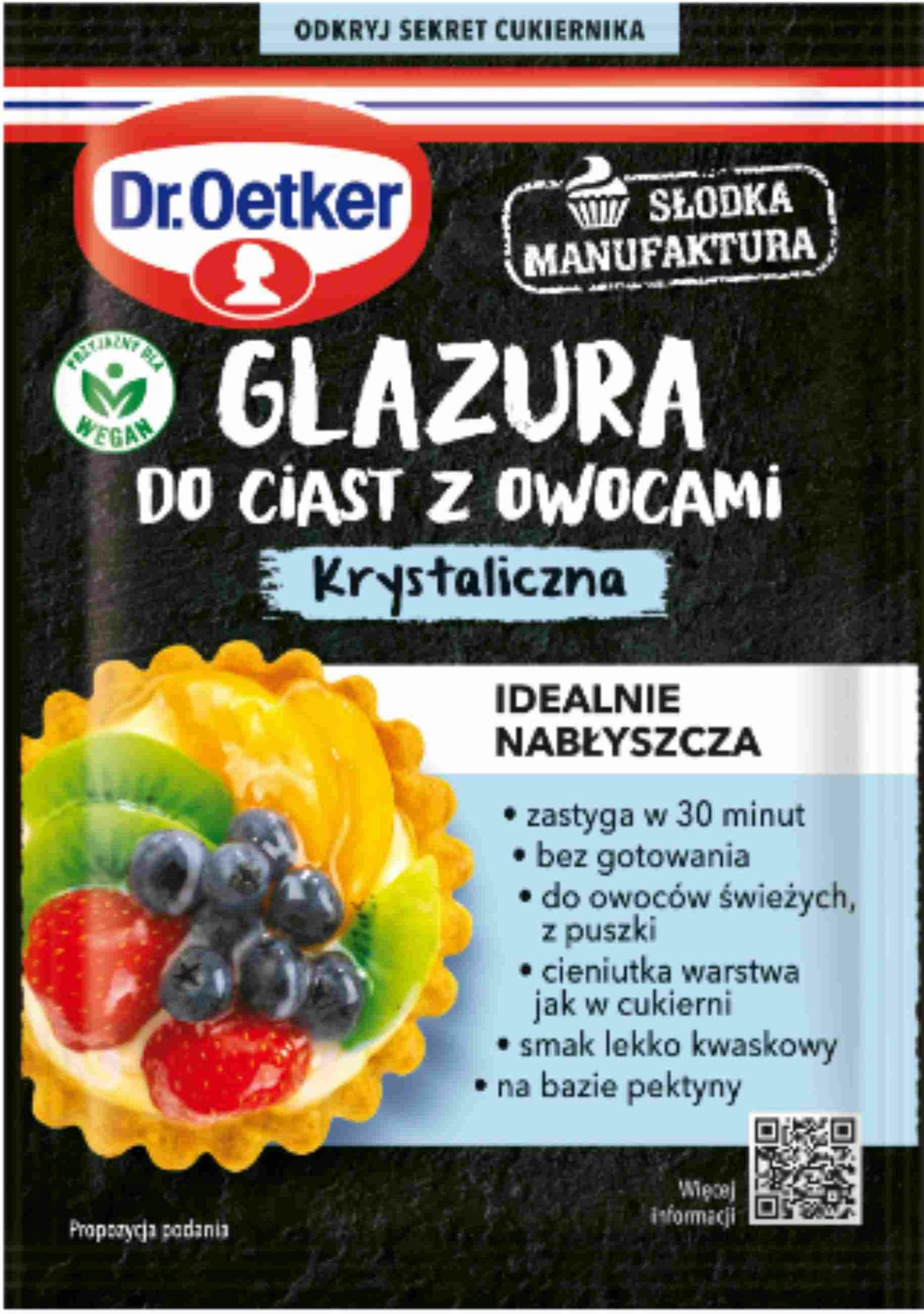 Idealnie nabłyszcza: - zastyga w 30 min - bez gotowania - do owoców świeżych, z puszki - cieniutka warstwa jak w cukierni - smak lekko kwaskowy - na bazie pektyny Branża: 20 EAN: 5900437888811 Ilość w opakowaniu zbiorczym: 1 Półka: 0 Regał: 0 Parametry produktu: : Przeznaczenie: Do przyrządzenia glazury krystalicznej do ciasta Składniki: Cukier, substancja żelująca (pektyny), regulator kwasowości (kwas cytrynowy). możliwa obecność mleka i zbóż zawierających gluten. Kraj pochodzenia/Wyprodukowano w: Polska Zawartość netto: 10 g Waga jednostkowa brutto: 0,01 kg Adres podmiotu wprowadzającego do obrotu: Nazwa firmy: dr.oetker polska sp. z o.o. ulica i numer: dickmana 14/15 kod pocztowy i miasto: 80-339 gdańsk pl Liczba opakowań pierwszego rzędu na palecie: 459 op. zb. (DU) Alergeny: : Orzechy: Nie Ryby i produkty pochodne: Nie Seler i produkty pochodne: Nie Skorupiaki i produkty pochodne: Nie Soja i produkty pochodne: Nie Zboża zawierajace gluten: Może zawierać Dwutlenek siarki i siarczyny: Nie Gorczyca i produkty pochodne: Nie Jaja i produkty pochodne: Nie Łubin i produkty pochodne: Nie Mięczaki i produkty pochodne: Nie Mleko i produkty pochodne (łącznie z laktozą): Może zawierać Nasiona sezamu i produkty pochodne: Nie Przechowywanie: : Sposób przechowywania: przechowywać w suchym i chłodnym miejscu Instrukcje dotyczące przygotowania: 1. zagotuj wodę i odmierz 250 ml. 2. zawartość torebki wsyp do naczynia z gorącą wodą, dodaj 2 płaskie łyżki cukru i wymieszaj rózgą (ok. 3 min) do całkowitego rozpuszczenia. 3. naczynie z rozmieszaną glazurą odstaw nie mieszając na ok. 15-17 min w temp. pokojowej do momentu aż zacznie tężeć. w czasie tężenia glazura może być mniej klarowna. to typowe dla pektyny. 4. tężejącą glazurę rozprowadź na owocach łyżką. jeśli glazura za bardzo stężeje, możesz ją ponownie podgrzać do stanu płynnego i ostudzić do uzyskania lekko tężejącej konsystencji. 5. gotowe ciasto wstaw do lodówki na ok. 15 min, aż glazura całkowicie zastygnie. Wartość odżywcza: : Jednostka będąca podstawą przeliczeń: g/100 g Wartość energetyczna kcal: 45 kcal Wartość energetyczna kJ: 192 kJ Zawartość białek: 0 g Zawartość soli: 0,06 g Kwasy tłuszczowe nasycone: 0 g Zawartość tłuszczów (ogólnie): 0 g Cukry: 11 g Zawartość węglowodanów: 11 g