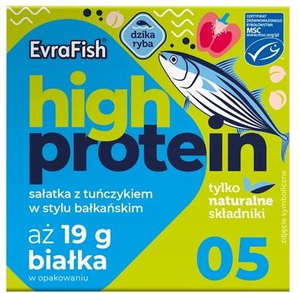 PROTEINOWA sałatka z tuńczykiem w stylu bałkańskim konserwa EVRAFISH - 160 g Masz ochotę na rybny przysmak? Koniecznie spróbuj Filetów z makreli w sosie bałkańskim EvraFish i przekonaj się, jak smakuje jakość z polskich zakładów! Doskonałe połączenie świeżego tuńczyka w occie winnym z ciecierzycą, ogórkiem, papryką czerwoną, marchewką i cebulą. Ten najwyższej jakości rybny specjał został przygotowany według tradycyjnego przepisu, dzięki czemu jest niezastąpionym składnikiem sałatek. Dzięki przemyślanej recepturze i restrykcyjnie selekcjonowanym składnikom Sałatka z tuńczykiem w stylu bałkańskim EvraFish jest gotowa od razu do jedzenia! Doskonały smak, tradycyjna receptura, naturalne składniki wysokiej jakości. Danie gotowe do podania! Zawsze pod ręką! Niezastąpiony dodatek do kanapek. Danie zamknięte w puszce z wieczkiem typu easy open. Nie wymaga otwieracza. Łatwy i wygodny sposób przygotowania. Produkt High Protein! Sałatka zawiera aż 19 g białka w opakowaniu. Idealne rozwiązanie w domu, podczas wyprawy czy obozowania przy ognisku. Pozycja wprost obowiązkowa dla miłośników aktywnej turystyki. Nie potrzebujesz lodówki, żeby zabrać ją ze sobą! Niewątpliwym plusem konserwy jest to, że nie zepsuje się jak wędlina czy ser, dlatego pakiet Konserwa EvraFish + pieczywo da Ci możliwość przygotowania na szybko świeżego posiłku. To poręczne opakowanie z wieczkiem typu easy open otworzysz w każdych warunkach! Możesz je śmiało wrzucić do plecaka - nie odczujesz jego wagi, a będziesz mieć pewność, że po długiej wędrówce zaspokoisz głód i dostarczysz organizmowi energii do kolejnych działań. Nie musisz się też martwić, że konserwa uwolni swoją zawartość do Twojego plecaka. Puszka jest naprawdę solidnie wykonana i niestraszne jej byle wstrząsy - została skonstruowana tak, by zachować szczelność opakowania w różnych warunkach. Szczegółowe informacje Makrela / Konserwa / Produkt High Protein / Żywność konserwowana / Opakowanie easy open / EvraFish Produkt: Proteinowa sałatka z tuńczykiem w stylu bałkańskim Masa netto: 160 g Składniki: 26% tuńczyk pasiasty* rozdrobniony, 17,8% ciecierzyca, woda, ogórek, 5% papryka czerwona, olej rzepakowy tłoczony na zimno, soja ziarno, marchew, cebula, nasiona konopi siewnej, przecier jabłkowy, obłuszczone ziarno owsa, fasola czarna ziarno, cukier trzcinowy, ocet winny, skoncentrowany moszcz winogronowy, sól, pieprz czarny mielony, ocet spirytusowy, ekstrakty roślinne (groszek, marchewka). Może zawierać: gorczycę, zboża zawierające gluten (z pszenicy i jęczmienia), mleko, seler i jaja. * Tuńczyk pasiasty [Euthynnus (Katsuwonus Pelamis)] ze zrównoważonych połowów posiadających certyfikat MSC-C-54739. Opakowanie: puszka z wieczkiem typu easy open. Nie wymaga otwieracza. Przechowywanie: w temperaturze od +4°C do +25°C. Spożyć bezpośrednio po otwarciu. Wartość odżywcza w 100 g produktu Wartość energetyczna: 161 kcal Tłuszcz: 8 g w tym kwasy tłuszczowe nasycone: 0,7 g Węglowodany: 8,8 g w tym cukry: 3,8 g Białko: 12 g Sól: 1,1 g