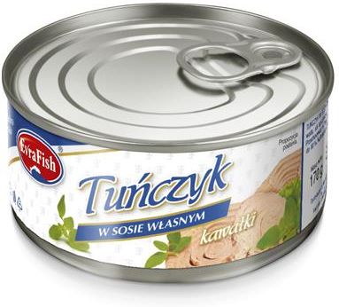 EVRA - TUŃCZYK KAWAŁKI W SOSIE WŁASNYM Z WODĄ - 170 G Czas na zdrową, rybną przekąskę! Koniecznie wypróbuj soczyste kawałki tuńczyka w sosie własnym EvraFish i przekonaj się, jak smakuje jakość wyrobów od polskiego dystrybutora. Wyborne kawałki tuńczyka w sosie własnym z wodą bez zbędnych dodatków - to klasyk, który możesz zjeść zarówno sauté, jak również wykorzystać jako bazę do sałatek, past, smarowideł, dodatek do dań z makaronem i wielu innych. Kawałki tuńczyka w sosie własnym z wodą EvraFish składają się wyłącznie z dokładnie selekcjonowanych, naturalnych składników, dzięki czemu masz pewność, że wybierasz dla siebie i swojej rodziny to, co najlepsze! Opakowanie: puszka z wieczkiem typu easy open. Nie wymaga otwieracza. Masa netto : 170 g Masa netto po odsączeniu: 120 g Konserwa: konserwa rybna, sterylizowana. Składniki: tuńczyk (katsuwonus Pelamis) 70%, woda, sól. Nie potrzebujesz lodówki, żeby zabrać tuńczyka ze sobą! Niewątpliwym plusem konserwy jest to, że nie zepsuje się jak wędlina czy ser, dlatego pakiet zamknięte opakowanie Kawałów tuńczyka w sosie + pieczywo da Ci możliwość przygotowania na szybko świeżego posiłku. To poręczne opakowanie z wieczkiem typu easy open otworzysz w każdych warunkach! Możesz je śmiało wrzucić do plecaka - nie odczujesz jego wagi, a będziesz mieć pewność, że po długiej wędrówce zaspokoisz głód i dostarczysz organizmowi energii do kolejnych działań. Nie musisz się też martwić, że konserwa uwolni swoją zawartość do Twojego plecaka. Puszka jest naprawdę solidnie wykonana i niestraszne jej byle wstrząsy - została skonstruowana tak, by zachować szczelność opakowania w różnych warunkach. Idealne rozwiązanie w domu, podczas wyprawy czy obozowania przy ognisku. Pozycja wprost obowiązkowa dla miłośników aktywnej turystyki. WARTOŚĆ ODŻYWCZA W 100 g PRODUKTU po odsączeniu: Wartość energetyczna: 378,19 kJ /90,26 kcal Tłuszcz: 0,9 g - w tym kwasy tłuszczowe nasycone: 0,37 g Węglowodany: 0,0 g w tym cukry: 0,0 g Białko: 20,54 g Sól: 1,6 g Przechowywać w temperaturze od +4°C do +25°C, wilgotność względna do 80%