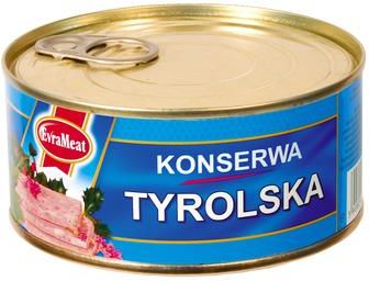 EvraMeat KONSERWA TYROLSKA mięso wieprzowe drobiowe EASY OPEN Polska - 300g EvraMeat KONSERWA TYROLSKA - 300 g Masz ochotę na pyszną konserwę? Chcesz, by Twoje ulubione kanapki nabrały niepowtarzalnego smaku? ⭐ Wybierz prawdziwy konserwowy klasyk - Konserwę Tyrolską EvraMeat - i przekonaj się, jak smakuje jakość z wielkopolskich zakładów mięsnych! Ta pyszna konserwa została skomponowana z wysokogatunkowej wieprzowiny, drobiu oraz aromatycznych przypraw, tak by zamknąć w wygodnym, pojemnym opakowaniu smak ulubionego specjału z dzieciństwa. Dzięki odpowiedniej ilości smakowitego tłuszczyku konserwa nie jest sucha, a rozpływa się w ustach. Konserwa Tyrolska EvraMeat będzie doskonała zarówno jako konserwa, jak i smarowidło do kanapek. Niezwykle soczyste mięsobardzo dobrze nakłada się na pieczywo. Możesz ją dodawać także do makaronów i innych potraw, w zależności od Twojej fantazji i gustu. ⭐ Poręczne opakowanie easy open otworzysz w każdych warunkach! Nie potrzebujesz lodówki, żeby zabrać go ze sobą! Niewątpliwym plusem konserwy jest to, że nie zepsuje się jak wędlina czy ser, dlatego pakiet zamknięte opakowanie konserwa tyrolska + pieczywo da Ci możliwość przygotowania na szybko świeżego posiłku. To pojemne opakowanie z wygodnym wieczkiem typu easy open możesz śmiało wrzucić do plecaka - nie odczujesz jego wagi, a będziesz mieć pewność, że po długiej wędrówce zaspokoisz głód i dostarczysz organizmowi energii do kolejnych działań. Nie musisz się też martwić, że konserwa uwolni swoją zawartość do Twojego plecaka. Puszka jest naprawdę solidnie wykonana i niestraszne jej byle wstrząsy - została skonstruowana tak, by zachować szczelność w różnych warunkach. Idealne rozwiązanie w domu, podczas wyprawy czy obozowania przy ognisku. Pozycja wprost obowiązkowa dla miłośników aktywnej turystyki. Szczegółowe informacje: ✅ Konserwa mięsna / Konserwa tyrolska / Żywność konserwowana / Opakowanie easy open ✅ Produkt: Konserwa tyrolska ✅ Opakowanie: puszka z wieczkiem typu easy open. Nie wymaga otwieracza. ✅ Konserwa: sterylizowana, wieprzowo-drobiowa. ✅ Przechowywanie: w suchym pomieszczeniu w temperaturze od +1°C do +25°C. Po otwarciu przechowywać w lodówce i spożyć w ciągu 24 godzin. Data minimalnej trwałości jest jednocześnie numerem partii produkcyjnej. ✅ Składniki: woda, mięso wieprzowe oddzielone mechanicznie (12%), mięso oddzielone mechanicznie z kurcząt (12%), mięso wieprzowe (10%), skórki wieprzowe, tłuszcz wieprzowy, sól, skrobia modyfikowana, białko sojowe, panier (mąka pszenna, sól), błonnik pszenny, stabilizatory: difosforany tetrasodowe, przyprawy, czosnek suszony, wzmacniacz smaku: glutaminian sodu; przeciwutleniacz: askorbinian sodu, substancja konserwująca: azotyn sodu. ✅ Masa netto: 300 g ✅ Wartość odżywcza w 100 g produktu: tłuszcz: 13 g, w tym kwasy tłuszczowe nasycone: 5,2 g, węglowodany: 2,1 g, w tym cukry: <0,5 g, białko: 1 g, sól: 2,1 g, ✅ Wartość energetyczna: kJ / 100 g - 689 kJ kcal / 100 g - 166 kcal ✅ EAN13: 5908241636963