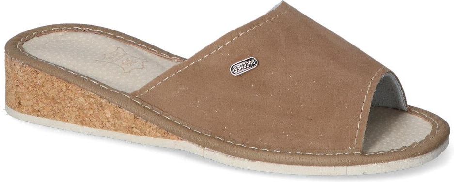 Wygodne kapcie producenta Maximus:- cholewka została wykonana ze skóry naturalnej zamszowej - wnętrze zostało pokryte skórą naturalną aby zapewnić komfort podczas użytkowania - spód wykonany został z gumy EVA, co zapewnia jego antypoślizgowość - wykonany z naturalnego korka koturn o wys. 3,5 cm zapewnia stabilizację - beżowy kolor w modnym fasonie zadowolą każdą kobietę!