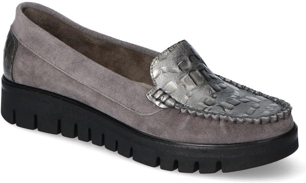 Wyjątkowe mokasyny znanej marki Lemar: - cholewka wykonana została ze skóry naturalnej zamszowej - wnętrze zostało pokryte skórą naturalną aby zapewnić komfort podczas użytkowania - koturn o wys. 4 cm zapewnia stabilizację i nadaje elegancji - szary kolor w połączeniu z tłoczoną fakturą tworzą efekt, który zachwyci każdą kobietę!