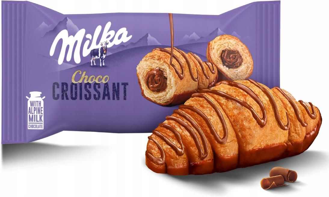 Rogalik z ciasta francuskiego z nadzieniem (30 %) z mleczną czekoladą z mleka alpejskiego (2 %), ze spodem pokrytym mleczną czekoladą z mleka alpejskiego (18 %), polany mleczną czekoladą z mleka alpejskiego (4 %). Składniki cukier;mąka pszenna;olej palmowy;woda;odtłuszczone mleko w proszku;tłuszcz …