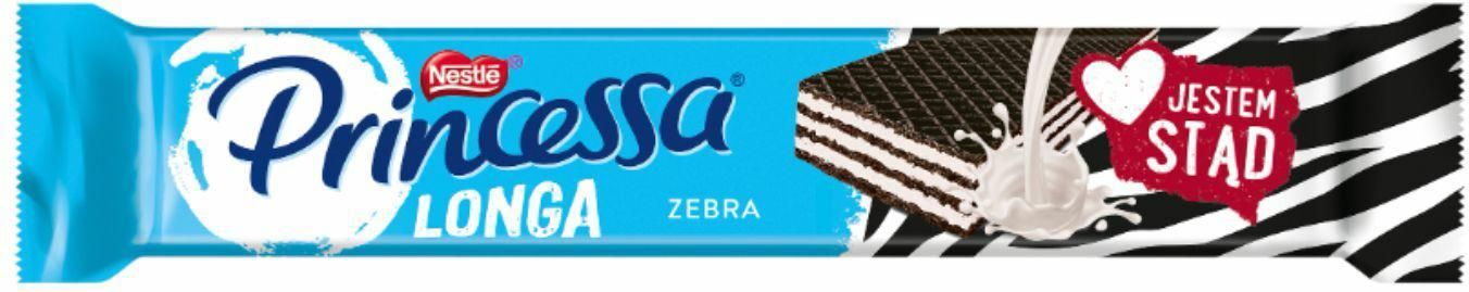 Zestaw zawiera 30x Princessa Longa Zebra Kakaowy wafelek przekładany kremem mlecznym 40 g Składniki olej palmowy mąka pszenna cukier odtłuszczone mleko w proszku (8,8 %) preparat serwatkowy w proszku (z mleka) pełne mleko w proszku (4,4 %) maltodekstryna kakao w proszku (1,5 %) o obniżonej zawartości tłuszczu¹,² substancje spulchniające (węglany sodu, węglany amonu) emulgator (lecytyny) sól Wartość odżywcza W 100 g Wartość energetyczna: 2322 kJ Wartość energetyczna: 557 kcal Tłuszcz: 34,2 g w tym kwasy tłuszczowe nasycone: 16,5 g Węglowodany: 54,2 g w tym cukry: 33,5 g Błonnik: 1,3 g Białko: 7,2 g Sól: 0,43 g