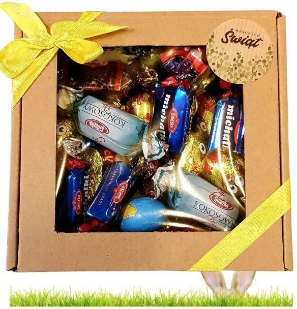To zestaw zawierający cukierki czekoladowe w mieszance. W skład miksu wchodzą losowo cukierki czekoladowe polskiej marki Śnieżka, czekoladowe jajeczka i czekoladki kurki. Pudełeczko z kwadratowym okienkiem. Pudełko o wymiarach 15 x 15 x 10 cm.