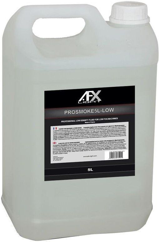 Płyn do wytwornicy dymu dymiarki LOW FOG 5L Kod produktu: PROSMOKE5L-LOW Zatwierdzony płyn do wytwornic dymu, wysokiej jakości, na bazie wody PROSMOKE5L-LOW marki AFX Mała gęstość, wytwarza nisko zawieszony dym. Nie zawiera szkodliwych substancji i nie pozostawia osadu. Baniak 5 litrowy. Można go używać do każdej większej wytwornicy dymu, najlepiej wspiera wytwornice dymu ciężkiego.