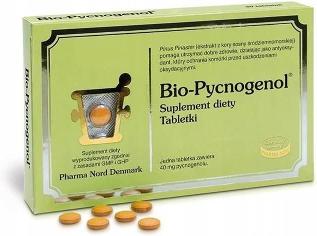 Bio-Pycnogenol to suplement diety, który pomaga zachować zdrowie i prawidłowe funkcjonowanie organizmu. W preparacie zawarto pycnogenol, czyli wyciąg z kory sosny francuskiej, będący niezwykle silnym antyoksydantem. Suplement diety Bio-Pycnogenol chroni komórki organizmu przed stresem oksydacyjnym, a także wspiera prawidłowe krążenie krwi i tym samym zmniejsza ryzyko chorób układu krążenia. Dodatkowo pycnogenol wpływa pozytywnie na profil lipidowy oraz na potencję.