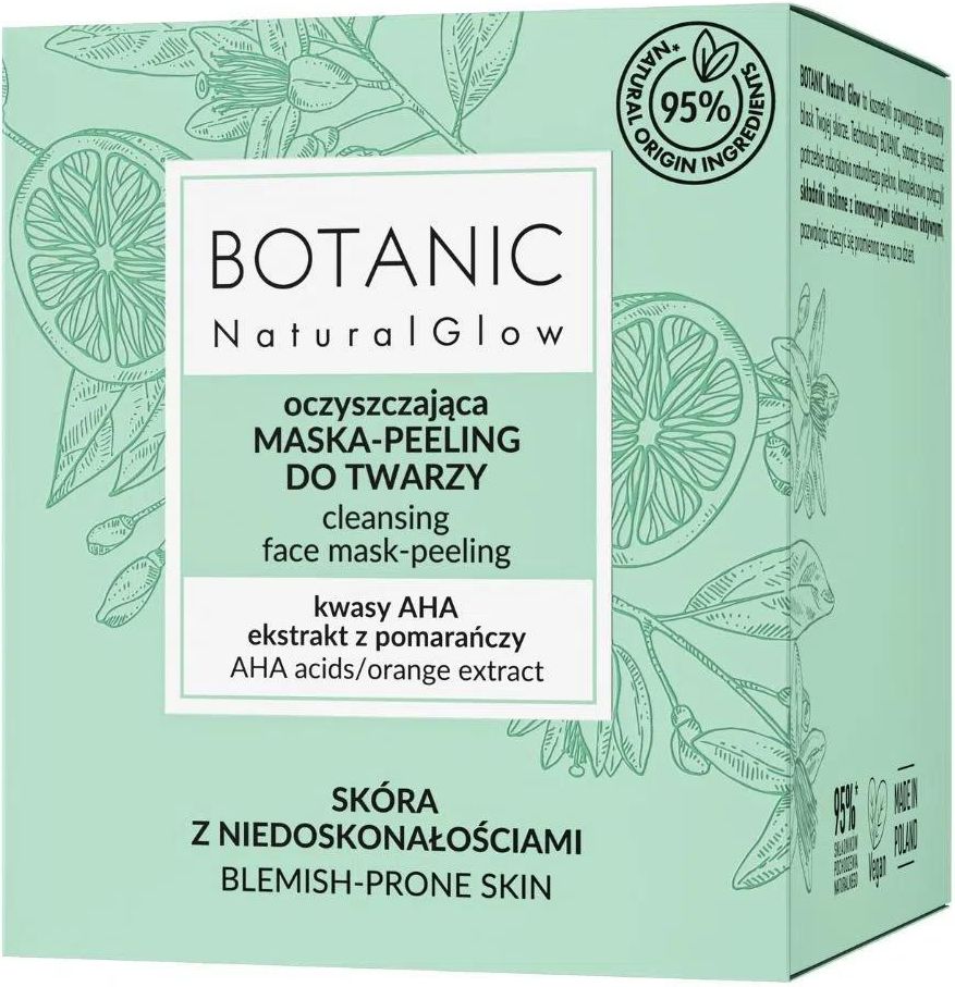Botanic oczyszczająca maska-peeling do twarzy z kwasem AHA i ekstraktem z pomarańczy – skóra z niedoskonałościamiBOTANIC Natural Glow to kosmetyki przywracające naturalny blask Twojej skórze. Technolodzy BOTANIC, starając się sprostać potrzebie odzyskania naturalnego piękna, kompleksowo połączyli składniki roślinne z innowacyjnymi składnikami aktywnymi, pozwalając cieszyć się promienną cerą na co dzień.Oczyszczająca maska-peeling do twarzyReceptura maski oczyści Twoją skórę i poprawi jej kondycję. Dzięki połączeniu ekstraktów z pomarańczy, cytryny i mango wraz z kompleksem kwasów AHA, przyspiesza procesy złuszczania martwych komórek naskórka i wspomaga jego regenerację. Działa nawilżająco i łagodząco. Po użyciu Twoja skóra odzyskuje gładkość, elastyczność i świeży wygląd.Sposób użyciaNanieść maskę-peeling na oczyszczoną skórę twarzy, omijając okolice oczu i ust. Po 15 minutach dokładnie zmyj wodą. Stosuj 2 -3 razy w tygodniu.Produkt przebadany dermatologicznie.95% składników pochodzenia naturalnego.Zmiana barwy produktu uwarunkowana jest wysoką zawartością składników pochodzenia naturalnego.Działanie składników naturalnych i aktywnych KWASY AHA (GLIKOLOWY, MLEKOWY, WINOWY, CYTRYNOWY, JABŁKOWY) działają złuszczająco, oczyszczają i wygładzają skórę oraz stymulują procesy jej regeneracji. EKSTRAKT Z POMARAŃCZY działa odświeżająco. EKSTRAKT Z MANGO nawilża i wygładza skórę.