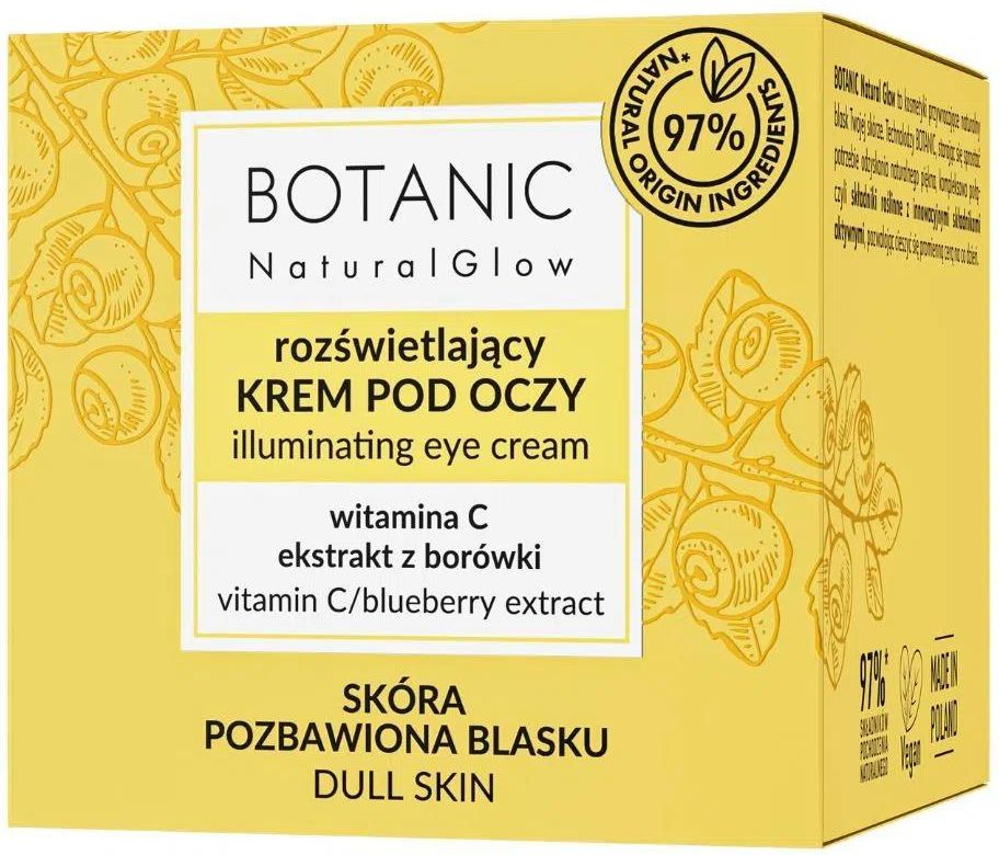 Botanic rozświetlający krem pod oczy z borówką i morwą białąBOTANIC Natural Glow to kosmetyki przywracające naturalny blask Twojej skórze. Technolodzy BOTANIC, starając się sprostać potrzebie odzyskania naturalnego piękna, kompleksowo połączyli składniki roślinne z innowacyjnymi składnikami aktywnymi, pozwalając cieszyć się promienną cerą na co dzień.Rozświetlający krem pod oczyReceptura kremu pozwoli przywrócić Twojej delikatnej skórze wokół oczu promienny wygląd. Dzięki połączeniu ekstraktów z borówki i morwy białej, wraz z witaminą C i kwasem hialuronowym, intensywnie nawilża skórę, poprawiając jej jędrność i elastyczność. Działa rozświetlająco oraz wspomaga procesy regeneracji. Po użyciu Twoja skóra wokół oczu jest odżywiona, wygładzona i pełna blasku.Sposób użyciaNanieś krem na oczyszczoną skórę wokół oczu. Stosuj codziennie rano i wieczorem.Produkt przebadany dermatologicznie.97% składników pochodzenia naturalnego.Działanie składników naturalnych i aktywnych WITAMINA C antyoksydant, rozjaśnia skórę oraz wyrównuje jej koloryt. KWAS HIALURONOWY intensywnie nawilża skórę. EKSTRAKT Z BORÓWKI posiada właściwości ujędrniające i rozjaśniające. EKSTRAKT Z MORWY BIAŁEJ działa regenerująco i przeciwzmarszczkowo.