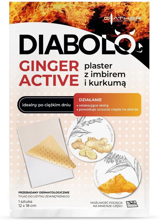 Plaster rozgrzewający DIABOLO GINGER ACTIVE z imbirem i kurkumą 1 sztuka Diabolo Ginger Active plaster z imbirem i kurkumą dzięki składnikom, takim jak wyciąg z korzenia imbiru i kurkumy, wyciąg z kadzidłowca i z kory wierzby białej oraz olejek z liści golterii rozesłanej, relaksuje i pozostawia uczucie ciepła na skórze. Produkt jest dobrze tolerowany przez skórę i dobrze do niej przylega. Plaster zawiera mieszaninę wyciągów roślinnych, które uwalniają swoje cenne substancje podczas kontaktu plastra ze skórą. Wyciąg z korzenia imbiru to ceniona w kuchniach całego świata przyprawa, która na skórze wykazuje działanie przeciwstarzeniowe, rozjaśniające i antybakteryjne. Wyciąg z korzenia kurkumy zawiera silne antyoksydanty, takie jak kurkumina, które pomagają neutralizować wolne rodniki odpowiedzialne za przedwczesne starzenie się skóry. Dzięki temu, ekstrakt z kurkumy może wspierać regenerację skóry i chronić przed uszkodzeniami wywołanymi przez promieniowanie UV. Wyciąg z kadzidłowca (Boswellia serrata) posiada właściwości przeciwutleniające, które pomagają chronić skórę przed działaniem wolnych rodników i uszkodzeniami spowodowanymi przez czynniki środowiskowe, takie jak promieniowanie UV czy zanieczyszczenia. Dzięki temu, ekstrakt wspiera procesy regeneracji skóry, opóźniając oznaki starzenia się. Wyciąg z kory wierzby białej posiada właściwości antyseptyczne i przeciwbakteryjne. Ma intensywny, świeży zapach, który pobudza zmysły, dzięki temu koi oraz stymuluje. Olejek eteryczny z liści golterii rozesłanej posiada właściwości antyseptyczne i przeciwbakteryjne. Ma intensywny, świeży zapach, który pobudza zmysły, dzięki temu koi oraz stymuluje i ujędrnia skórę. Sposób użycia Po zdjęciu warstwy ochronnej przykleić plaster na czystą i suchą skórę. W przypadku pojawienia się silnego pieczenia należy natychmiast usunąć plaster. Nie pozostawiać na skórze dłużej niż 12 godzin. Składniki colophonium, zinc oxide, styrene/butadiene copolymer, zingiber officinale root extract, paraffinum liquidum, salix alba bark extract, curcuma longa root extract, boswellia serrata extract, vanillyl butyl ether, carbomer, gaultheria procumbens leaf oil. Szczególne środki ostrożności Produkt przeznaczony do użytku zewnętrznego. Nie stosować na rany, miejsca uszkodzone chorobowo lub uszkodzoną skórę. Unikać kontaktu z oczami i błonami śluzowymi, a w razie kontaktu natychmiast przemyć dużą ilością wody. Po zastosowaniu dokładnie umyć ręce. Nie stosować w przypadku uczulenia na którykolwiek składnik plastra. Nie stosować u dzieci poniżej 12. roku życia oraz u kobiet w ciąży i karmiących piersią. Uczucie ciepła i mrowienia wynika z zastosowanych surowców. Nie używać plastra w przypadku silnego pieczenia. Przechowywać w miejscu niedostępnym i niewidocznym dla małych dzieci. Firma Diather posiada certyfikat ISO 13485:2016, wydany przez akredytowaną jednostkę certyfikującą IMQ, w zakresie magazynowania i dystrybucji testów diagnostycznych IVD. Podczas audytu certyfikującego oraz kolejnych audytów nadzoru potwierdzono, że magazynowanie i dystrybucja produktów przebiegają zgodnie z wymaganiami pkt 6.4 normy ISO 13485:2016. Firma dba o środowisko pracy, kontroluje poziom zanieczyszczeń oraz monitoruje kluczowe parametry środowiskowe, takie jak temperatura i wilgotność, zarówno w magazynie, jak i podczas transportu. Firma posiada wdrożone postępowanie w ramach nadzorowania czystości i higieny Firma Diather prowadzi dokumentację wyrobu medycznego adekwatnie do roli dystrybutora podczas procesów magazynowania i dystrybucji co zapewnia identyfikację i identyfikowalność dystrybuowanych wyrobów. Jest to nasza znacząca przewaga konkurencyjna – wielu sprzedawców na platformach takich jak Allegro to tzw. sprzedawcy „garażowi”, którzy konkurują wyłącznie niską ceną. Dodatkowo posiadamy certyfikat „Odkrycie Konsumenta 2024”, co potwierdza wysoką jakość naszych usług i produktów." Na mocy art. 38 pkt 5 u.p.k. prawo odstąpienia od umowy zawartej poza lokalem przedsiębiorstwa lub na odległość nie będzie przysługiwać konsumentowi (jak również przedsiębiorcy na prawach konsumenta) w odniesieniu do umowy, której przedmiotem świadczenia jest rzecz dostarczana w zapieczętowanym opakowaniu, której po otwarciu opakowania nie można zwrócić ze względu na ochronę zdrowia lub ze względów higienicznych, jeżeli opakowanie zostało otwarte po dostarczeniu.ot prowadzący reklamę: Diather Petrusewicz Sp. K.