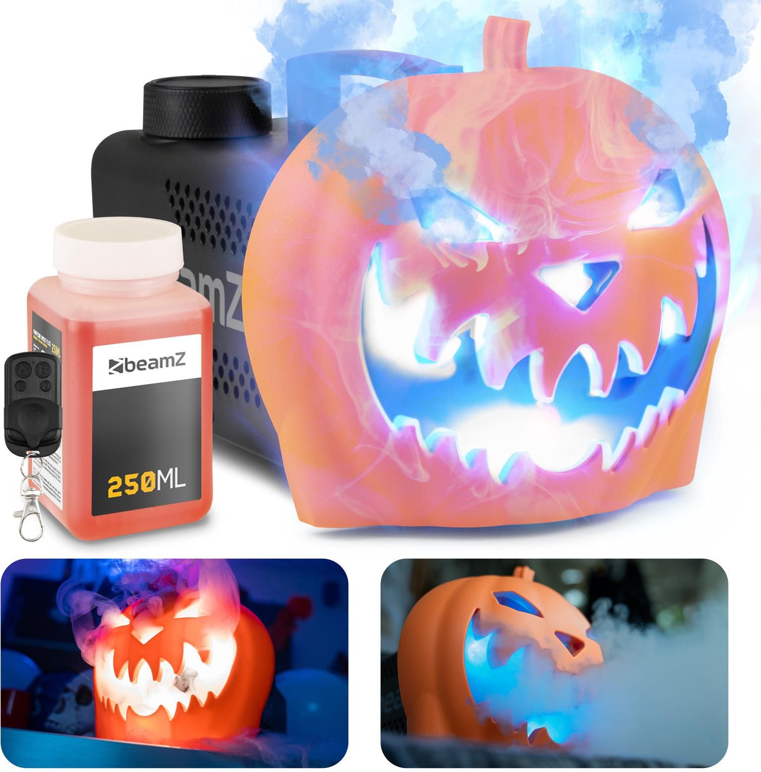 Zestaw Halloweenowy Wytawornica LED z pilotem + dedykowana maska dyni halloweenowej + płyn Wytwornica dymu na Halloween z efektami świetlnymi Zrób furorę na swoim kolejnym przyjęciu Halloween dzięki dyniowej wytwornicy dymu od BeamZ, idealnie zaprojektowanej, by nadać twojej imprezie przerażającą …