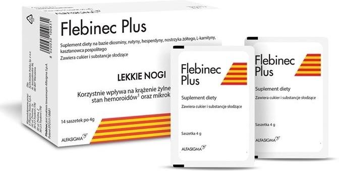 Flebinec Plus saszetki to innowacyjny suplement diety, który wpływa korzystnie na funkcjonowanie układu żylnego i limfatycznego. Skuteczność preparatu gwarantuje specjalnie skomponowany skład, który obejmuje m.in. diosminę w formie zmikronizowanej, hesperydynę, a także L-karnitynę i rutynę. Suplement diety Flebinec Plus w saszetkach polecany jest szczególnie osobom z zespołem ciężkich nóg, zmagającym się z obrzękami i uczuciem zmęczonych nóg. Saszetki z diosminą i hesperydyną to dobry wybór również w przypadku hemoroidów.