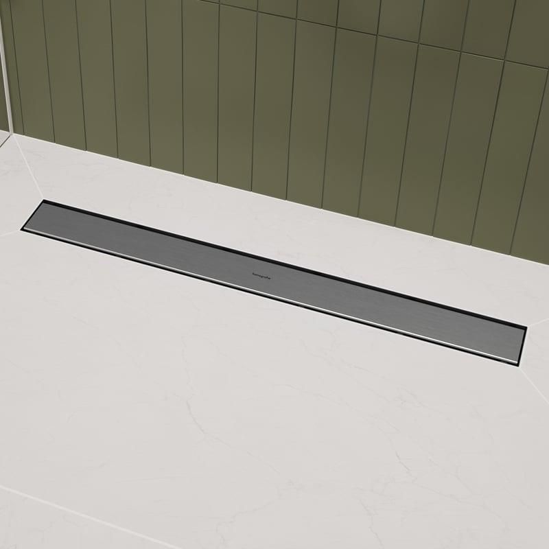 Hansgrohe RainDrain Go Kompletny odpływ liniowy 900, ruszt ozdobny/do wyłożenia płytkami, standardowy/niski składa się z: element zewnętrzny odpływu liniowego, Syfony, zestawy instalacyjny, wstępnie zamontowana membrana uszczelniająca, narzędzie do demontażu rusztu materiał rusztu: Stal szlachetna 304 (1.4301) materiał zestawu montażowego: Stal szlachetna 304 (1.4301) wysokość zamknięcia wodnego: 30 mm, 50 mm średnica przyłącza: DN40, DN50 położenie przyłącza odpływowego: poziomy powierzchnia łatwa w czyszczeniu obszar zastosowania: nowe budownictwo, renowacja obrotowy i regulowany korpus syfonu łatwy w czyszczeniu syfon narzędzie do demontażu rusztu umożliwia łatwy demontaż elementu zewnętrznego materiał syfonu: ABS typ montażu: montaż odsunięty od ściany możliwość wyłożenia płytkami od drugiej strony głębokość rusztu do wklejenia płytki: 12 mm możliwość wyboru pomiędzy dwoma syfonami, niskim lub standardowym nadaje się do odwodnienia pierwotnego i wtórnego RainDrain Go oferuje maksymalną swobodę dzięki możliwości instalacji w dowolnym miejscu podłogi w strefie prysznica, którą ten system odpływowy perfekcyjnie uszczelnia. Wysokość zestawu instalacyjnego można wyregulować, a w komplecie dostarczane są dwa syfony, do montażu płytkiego i standardowego. Dzięki temu RainDrain Go jest bezproblemowym rozwiązaniem odpływu w strefie prysznica walk-in w projektach mieszkaniowych i obiektowych. Ten odpływ liniowy cechuje duża wydajność odwodnienia wynosząca 39 l/min, łatwe czyszczenie i długowieczna jakość. Syfon i sitko na włosy można w razie potrzeby łatwo wyjąć i oczyścić. Do wyboru jest ozdobny ruszt w dwóch wariantach wykończenia, stal szlachetna szczotkowana i matowa czerń FinishPlus. Możesz również obłożyć drugą stronę płytkami dla efektu indywidualnej aranżacji. W ten sposób RainDrain Go wpisuje się w najróżniejsze, nowoczesne koncepcje projektowe.