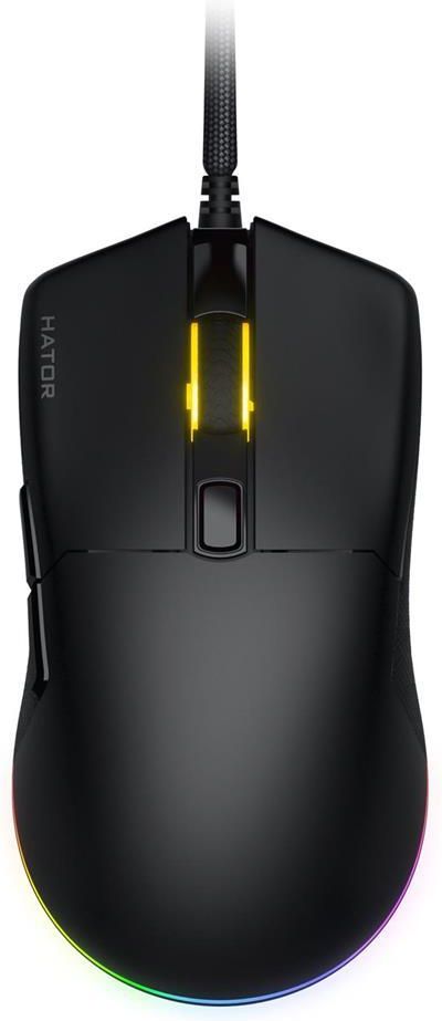 Mysz dla graczy Hator Pulsar 3 czarna Typ myszy: dla graczy Komunikacja: przewodowa Interfejs: USB Rodzaj sensora: optyczny Rozdzielczość (DPI): 12000 DPI Ilość przycisków: 5 Długość kabla: 1,8 m Podświetlenie: nie Wymiary: 123 x 68 x 38 mm Masa: 62 g Kolor: czarny Hator Pulsar 3 HATOR Pulsar 3 to doskonały wybór dla graczy szukających idealnego połączenia precyzji, wygody i wydajności w przystępnej cenie. Dzięki ultralekkiej konstrukcji (tylko 62 g) i symetrycznemu kształtowi zapewnia komfort nawet podczas wielogodzinnych sesji gamingowych. Czujnik o rozdzielczości do 12 000 DPI gwarantuje absolutną precyzję i szybki czas reakcji, a przełączniki optyczne HATOR (wytrzymałość: 100 milionów kliknięć) oferują natychmiastową odpowiedź i przyjemne wrażenia dotykowe. Elastyczny kabel minimalizuje opory, zapewniając wrażenie bezprzewodowej swobody, a podkładki PTFE pozwalają na płynne poruszanie się po każdej powierzchni. Podświetlenie LED z 12 strefami RGB oraz indykator DPI na kółku przewijania dodają stylu i funkcjonalności, a dedykowane oprogramowanie umożliwia pełną personalizację ustawień, w tym czułości, mapowania przycisków i efektów świetlnych.