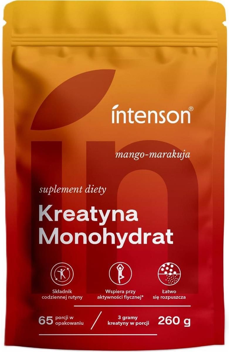 Intenson Kreatyna Monohydrat – smak mango-marakuja 260 g Intenson Kreatyna Monohydrat o smaku mango-marakuja to suplement diety stworzony z myślą o osobach aktywnych fizycznie, które chcą skutecznie wspierać rozwój masy mięśniowej, zwiększyć siłę oraz poprawić wydolność organizmu. W każdej porcji znajduje się czysta kreatyna w formie monohydratu – jednej z najlepiej przebadanych i najskuteczniejszych form tego składnika. Produkt został wzbogacony o naturalny smak egzotycznych owoców, dzięki czemu codzienna suplementacja staje się przyjemnym rytuałem. Dzięki wygodnej formie proszku kreatyna łatwo rozpuszcza się w wodzie i idealnie nadaje się do stosowania zarówno przed, jak i po treningu. Produkt nie zawiera zbędnych dodatków i wypełniaczy, a jego skuteczność i jakość potwierdza zaufanie sportowców i osób trenujących amatorsko. Dla kogo? Kreatyna Monohydrat Intenson w wersji smakowej mango-marakuja przeznaczona jest dla osób, które: trenują siłowo, wytrzymałościowo lub intensywnie i chcą zwiększyć wydajność, dążą do rozbudowy masy mięśniowej i poprawy regeneracji, szukają kreatyny w smacznej i łatwej do przyjmowania formie, chcą poprawić siłę mięśniową i wydolność w krótkich, intensywnych seriach ćwiczeń, wybierają produkty o czystym składzie i wysokiej jakości. Korzyści ze stosowania: Większa siła i energia podczas treningu - Monohydrat kreatyny wspiera resyntezę ATP – podstawowego nośnika energii w mięśniach. Dzięki temu zwiększa się moc, intensywność i efektywność wysiłku fizycznego. Wzrost masy mięśniowej - Kreatyna wspomaga procesy anaboliczne, sprzyjając zwiększaniu beztłuszczowej masy mięśniowej oraz poprawie objętości komórek mięśniowych. Poprawa regeneracji - Regularna suplementacja kreatyną przyspiesza odbudowę włókien mięśniowych po treningu i zmniejsza uczucie zmęczenia. Przyjemny smak mango-marakuja - Egzotyczny smak sprawia, że preparat można pić samodzielnie z wodą, bez potrzeby łączenia z innymi składnikami. Forma proszku – wygoda i precyzja dawkowania - Kreatyna w proszku umożliwia łatwe dostosowanie dawki do indywidualnych potrzeb i schematu treningowego. Jak stosować? 1 miarkę (4 g) wsyp do kubka i rozpuść w 250 ml letniej wody. Zalecane spożycie: 2 porcje dzienne (8 g).Dodatkowe informacje: suplementy diety nie mogą być stosowane jako zamienniki zróżnicowanej diety. Dla zachowania prawidłowego stanu zdrowia duże znaczenie ma zbilansowany sposób żywienia i zdrowy tryb życia. Nie należy przekraczać zalecanej porcji do spożycia w ciągu dnia. Produkt nie jest przeznaczony dla dzieci, kobiet w ciąży i w trakcie laktacji lub w przypadku nadwrażliwości na którykolwiek ze składników produktu. Zawiera substancje słodzące. Skład: Składniki: 85 % monohydrat kreatyny, 7,5 % aromaty naturalne (mango, marakuja), regulator kwasowości: kwas cytrynowy, substancja słodząca: glikozydy stewiolowe wytwarzane enzymatycznie. Składnik: na porcję 4 g/na porcję dzienną 8 gMonohydrat kreatyny - 3,4 g/6,8 g, w tym: - kreatyna 3 g/6 g