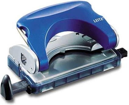 Dziurkacz LEITZ niebieski 50050035 Dziurkuje do 25 kartek (papier 80 gsm) Ergonomiczny uchwyt, umożliwiający zmniejszenie siły nacisku przy dziurkowaniu Precyzyjny ogranicznik formatu z okienkiem do jego podglądu, z wyraźnie oznaczonym formatem Opatentowany pojemnik na ścinki, który nie spada podczas opróżniania