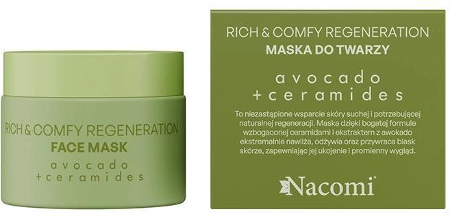 NACOMI Rich&Comfy Regeneration Avocado Maseczka do twarzy, 40ml NACOMI Rich&Comfy Regeneration Avocado Maseczka do twarzy to niezastąpione wsparcie cery suchej i potrzebującej naturalnej regeneracji. Dzięki bogatej formule wzbogaconej ceramidami i ekstraktem z awokado ekstremalnie nawilża, odżywia oraz przywraca blask skórze, zapewniając jej ukojenie i promienny wygląd. Zawarty olej z awokado dzięki swojemu bogactwu w witaminy, minerały i zdrowe tłuszcze doskonale nawilża i odżywia skórę, sprawiając, że staje się ona miękka i sprężysta. Ponadto, zawarte w nim przeciwutleniacze pomagają w zwalczaniu szkodliwych wolnych rodników, co spowolnienia proces starzenia się cery. Dodatkowo regeneruje i przyspiesza proces odnowy naskórka oraz wygładza i poprawia elastyczność skóry. Ceramidy należą do warstwy rogowej naskórka, będąc sporą częścią swego rodzaju cementu, wypełniającego przestrzeń międzykomórkową. Wraz z ekstraktem z awokado wzmacniają barierę hydrolipidową, tworząc na skórze szczelną warstwę ochronną. Połączenie ceramidów i awokado łagodzi podrażnienia i zaczerwienienie skóry oraz zapobiega przed nadmierną utratą wilgoci, chroniąc przed szkodliwymi czynnikami zewnętrznymi. Alantoina dzięki wielu korzystnym dla skóry właściwościom wspomaga regenerację, łagodzi zaczerwienienia oraz zmniejsza pieczenie i świąd skóry. Zmiękcza i wygładza skórę, chroni ją przed szkodliwym działaniem czynników zewnętrznych, a także wykazuje działanie antyoksydacyjne. Połączenie alantoiny, propanediolu i panthenolu łagodzi podrażnienia, wspomaga regenerację skóry, zmiękcza ją i wygładza oraz chroni przed szkodliwym wpływem czynników zewnętrznych. Zawarty w masce wysokocząsteczkowy polisacharyd sprawia, że cera staje się jedwabista. Tworzy na skórze ochronny film i zapewnia efekt natychmiastowego ukojenia. Jego właściwości aktywne, jak i sensoryczne, pomagają uzyskać dobre samopoczucie skóry. Dodatkowo nawilża, łagodzi, pobudza odnowę naskórka oraz działa przeciwstarzeniowo. Dodatkowo trehaloza i sorbitol działają jak naturalne bariery chroniące przed utratą wilgoci. Gliceryna, betaina i kwas hialuronowy doskonale nawilżają, pozostawiając skórę promienną, miękką i pełną blasku. Sposób użycia: Nałóż maskę na oczyszczoną i suchą skórę, omijając okolice oczu i ust. Odczekaj około 15 minut, po czym dokładnie zmyj lub pozostaw do całkowitego wchłonięcia. Unikaj kontaktu z oczami. NACOMI Rich&Comfy Regeneration Avocado Maseczka do twarzy skład: Aqua, Persea Gratissima Oil, Cetearyl Alcohol, Glycerin, Trehalose, Coco-Caprylate/Caprate, Panthenol, Propanediol, Betaine, Sorbitol, Persea Gratissima Fruit Extract, Ceramide AP, Ceramide NP, Ceramide EOP, Hyaluronic Acid, Hydrolyzed Hyaluronic Acid, Sodium Hyaluronate, Sodium Hyaluronate Crosspolymer, Cholesterol, Phytosphingosine, Allantoin, Inulin, Cellulose, Fructose, Glucose, Maltodextrin, Hydrolyzed Glycosaminoglycans, Tocopheryl Acetate, Sodium Cetearyl Sulfate, Tetrasodium Glutamate Diacetate, Sodium Levulinate, Polyglyceryl-10 Stearate, Polyglyceryl-6 Behenate, Xanthan Gum, Cellulose Gum, Biosaccharide Gum-1, Parfum, Triethyl Citrate, Potassium Cetyl Phosphate, Benzyl Glycol, Behenic Acid, Citric Acid, Ethylhexylglycerin, Glyceryl Stearate, Sodium Benzoate, Sodium Sulfate, Sodium Hydroxide, Raspberry Ketone, Potassium Sorbate, Amyl Cinnamal, Cl 19140, Cl 42090.