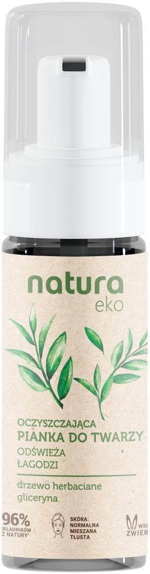 Pianka Do Mycia Twarzy Oczyszczająca 150 ml Oczyszczająca piankado mycia twarzy Natura Eko została stworzona na bazie pochodzących z natury, łagodnych substancji myjących. Lekka i kremowa konsystencja pianki skutecznie oczyszcza naskórek z zanieczyszczeń, pozostałości makijażu i nadmiaru sebum. Formuła wzbogacona olejkiem z drzewa herbacianego sprawia, że kosmetyk łagodzi podrażnienia oraz pozostawia cerę czystą, odświeżoną i gładką. Obecność roślinnej gliceryny sprawia, że produkt pielęgnuje cerę oraz nadaje uczucie nawilżenia i wygładzenia. Pianka przeznaczona jest do codziennej pielęgnacji cery normalnej, mieszanej, tłustej oraz trądzikowej. Sposób użycia: Niewielką ilość pianki nanieść na zwilżoną skórę twarzy omijając okolice oczu. Delikatnie wmasować do momentu uzyskania piany. Dokładnie spłukać wodą. Do użytku zewnętrznego SKU:H614894 EAN 5907747314894