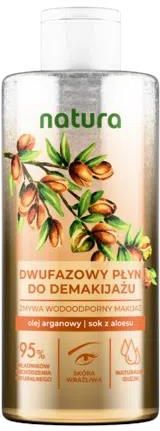 Dwufazowy płyn do demakijażu Natura to 95 % składnikówpochodzenia naturalnego. Skutecznie zmywa wodoodporny makijaż. Faza wodawzbogacona o sok z aloesu, który łagodzi delikatną skórę wokół oczu. Fazaolejowa zawiera olej arganowy zwany markońskim płynnym złotem, który bogatyjest w antyoksydanty oraz pielęgnuję i dba o zdrowy wygląd skóry.Sposób użycia: Wstrząśnij butelkę, aby połączyć obiefazy. Nasącz płatek kosmetyczny i dokładnie zmyj makijaż.