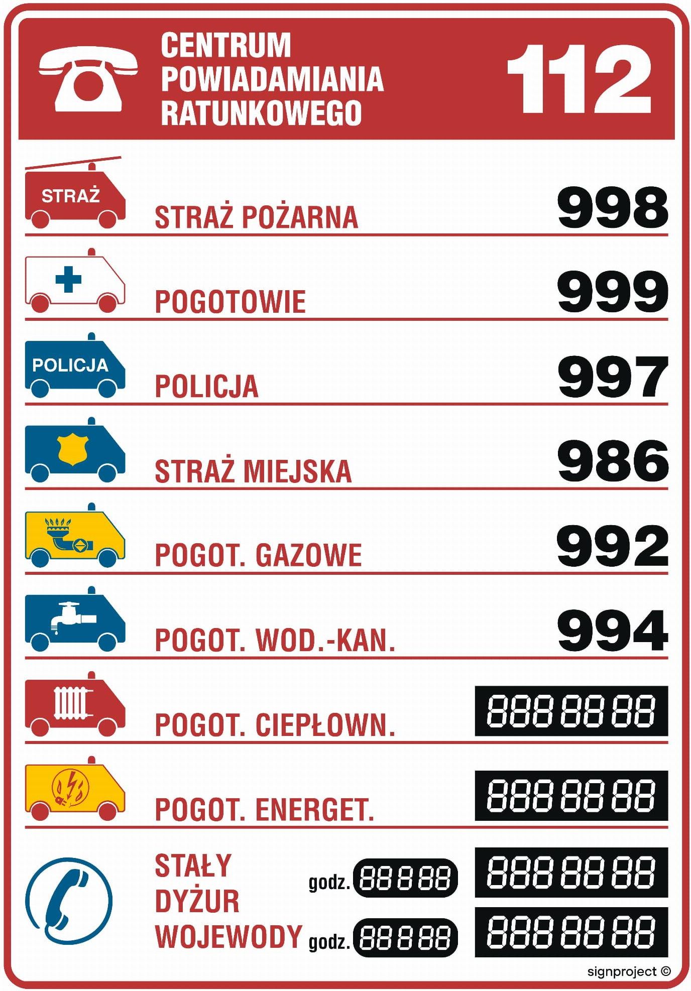Tabliczka z numerami telefonów alarmowych to niezbędny element wyposażenia każdego miejsca pracy, przestrzeni publicznej, a także domów i mieszkań, gdzie priorytetem jest bezpieczeństwo. Dzięki tej tabliczce, w sytuacjach kryzysowych, takich jak wypadki, pożary czy nagłe zasłabnięcia, nie trzeba tracić cennych sekund na szukanie odpowiednich numerów – wszystkie kluczowe informacje są zawsze pod ręką.Tabliczka z numerami telefonów alarmowychTabliczka z numerami telefonów alarmowych to kluczowy element wyposażenia, który zapewnia bezpieczeństwo w każdej przestrzeni – od miejsca pracy, przez przestrzenie publiczne, po domy i mieszkania. Dzięki niej, w sytuacjach kryzysowych, możesz szybko i skutecznie wezwać pomoc, nie tracąc cennych sekund na szukanie odpowiednich numerów. Trwałość: Wykonana z wytrzymałych materiałów, odpornych na wilgoć i uszkodzenia mechaniczne, zapewnia długowieczność i niezawodność. Wysoka czytelność: Duże, wyraźne cyfry i wyrazisty design gwarantują doskonałą widoczność numerów alarmowych, nawet z większej odległości. Uniwersalność: Tabliczka zawiera numery do najważniejszych służb ratunkowych: pogotowia, straży pożarnej, policji, dzięki czemu jest gotowa do użycia w każdej sytuacji. Łatwy montaż: Szybki i prosty montaż, zapewniający łatwy dostęp do najważniejszych numerów w razie potrzeby. Tabliczka z numerami alarmowymi to inwestycja w bezpieczeństwo, która może uratować życie w nagłych przypadkach. Zadbaj o to, by kluczowe informacje były zawsze w zasięgu ręki.Materiał: PN - płyta sztywna 1mmrozm: 21x29,7cm