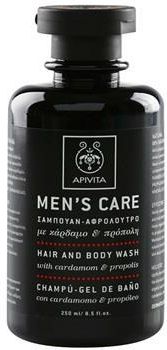 Apivita Men's Care Hair and Body Wash with Cardamon & Propolis, 250 ml, szampon i żel pod prysznic 2 w 1 dla mężczyzn, Żel pod prysznic Apivita Men's Care Hair and Body Wash with Cardamon & Propolis zmieni konieczną codzienną higienę w wyjątkowe odświeżające doznanie. Właściwości: można używać do ciała i włosów preparat jest specjalnie opracowany na potrzeby mężczyzn zapobiega wysuszeniu skóry łagodnie myje skórę całego ciała Skład: nie zawiera silikonów Sposób użycia: Nanieś preparat na wilgotną skórę i zmyj wszystkie zanieczyszczenia. Nanieś odpowiednią ilość szamponu na mokre włosy. Spień i potem dokładnie spłucz.