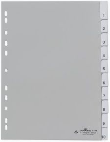 Przekładki do segregatorów ze wzmocnionymi brzegami zakładek oraz z wkładkami. Przekładki indeksujące z zgrzanymi kieszonkami i wymiennymi wkładkami Z zadrukowanymi wkładkami oraz dodatkowymi pustymi Czyste wkładki do profesjonalnego opisu z wykorzystaniem DURAPRINT® Okładka do opisu za pomocą EDP (tylko w przypadku białej wersji kolorystycznej) Podziałka indeksu / arkusz 1–10 Uniwersalny rozstaw dziurek Z PP Dla formatu w pełni zakrywa kartkę w formacie A4, w pionie Wymiary 297 x 215/230 mm