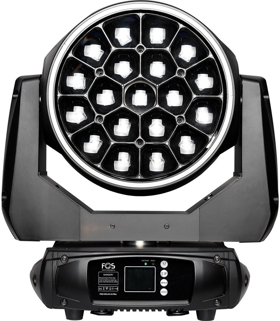 FOS Helix Ultra - głowa ruchoma Oprawa LED Ultra High Power Wash z pierścieniem pikseli, 19x40 watowe diody RGBW sterowane piksel po pikselu, zoom liniowy 4-60° okrągły pierścień LED z dynamicznymi wzorami, efekt wiru, regulacja temperatury barwowej, 28,38,102,114 kanałów DMX, tryb teatralny, …