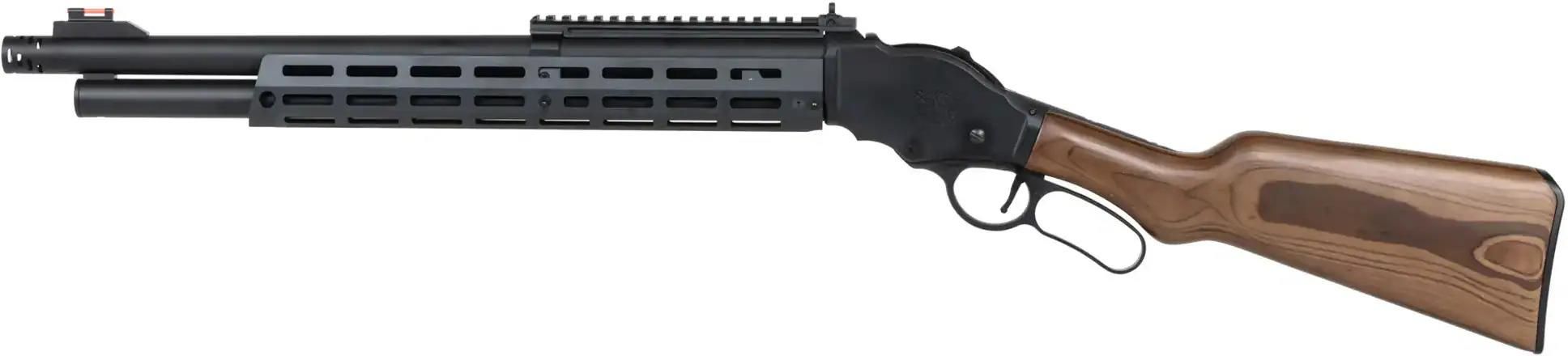 Replika strzelby lever action zasilana Green Gasem, wykonana z aluminium, stali oraz drewna. Wyposażona w łoże kompatybilne z systemem M-LOK i grzbietową szynę RIS.