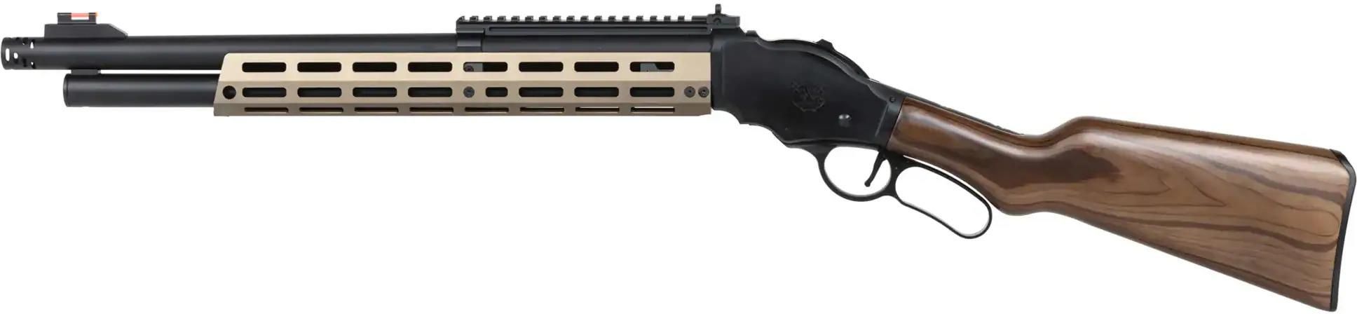 Replika strzelby lever action zasilana Green Gasem, wykonana z aluminium, stali oraz drewna. Wyposażona w łoże kompatybilne z systemem M-LOK i grzbietową szynę RIS.
