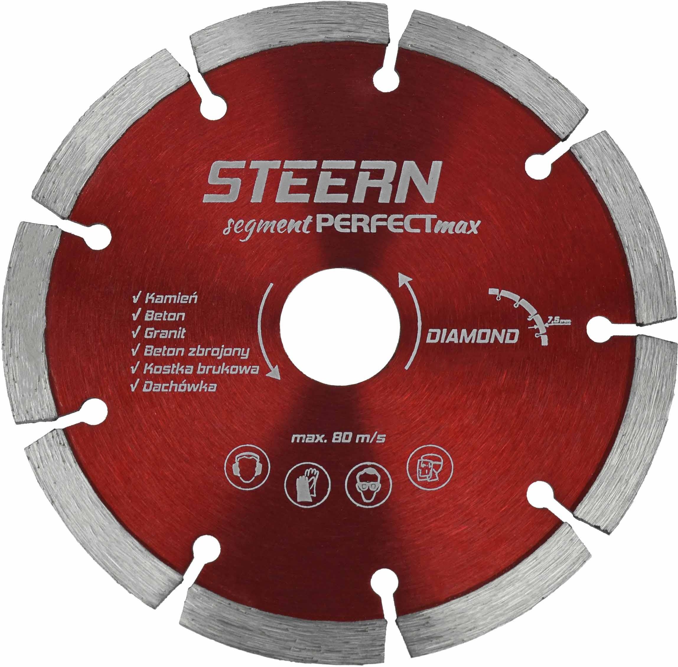 FI 180 Tarcza diamentowa segmentowa STEERN Perfect -Średnica tarczy: 180 mm -Średnica otworu tarczy: 22,23 mm SZCZEGÓLNE CECHY Wysokowydajna tarcza diamentowa do cięcia w bardzo twardych materiałach Idealnie sprawdza się przy pracach w betonie (w tym beton zbrojony o średnicy prętów do 8mm), kamieniu naturalnym Przeznaczone są równieżdo cięcia takich materiałów budowlanych jak granit, dachówka, cegła, kamień czy kostka brukowa Tarcza diamentowa charakteryzuje się bardzo szybkim, a także precyzyjnym cięciem różnej powierzchni Znakomicie sprawdza się zarówno do pracy na sucho jak i na mokro DANE TECHNICZNE Średnica tarczy: 180 mm Średnica otworu tarczy: 22,23 Grubość segmentu: 2,2 mm Szerokość ostrza tnącego: 7,5 mm Max. prędkość obrotowa: 8600 RPM Max. prędkość obwodowa: 80 m/s ZASTOSOWANIE kamień beton granit beton zbrojony kostka brukowa dachówka ZAKRES DOSTAWY 1 x FI 180 Tarcza diamentowa segmentowa STEERN Perfect