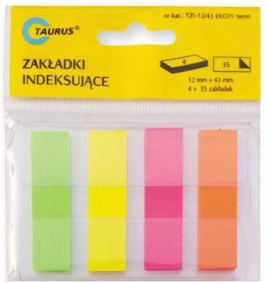 Zakładki indeksujące Turus TZI-12/43 EKO neon. Ilość kolorów: 4 kolory neonowe Ilość zakładek: 140 (4 x 35) Rozmiar zakładki: 12 x 43 mm Wykonane z folii PP, wielokrotnego użytku