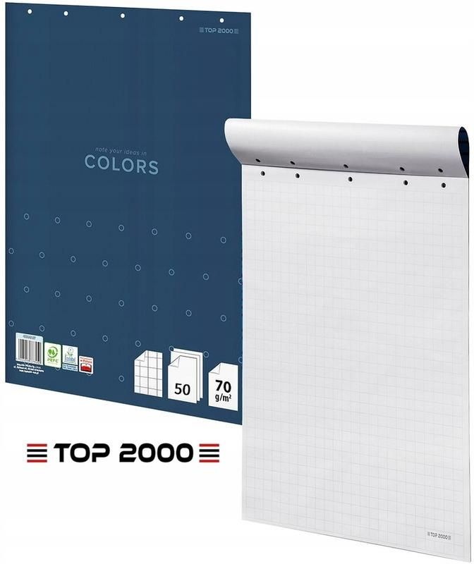 Blok do flipchartu Top 2000 Colors 64x90cm kratka (50) Top 2000 * blok do flipchartów COLORS TOP 2000 * blok do flipchartów jest niezastąpiony na każdym spotkaniu czy prezentacji * dzięki niemu można szybko zapisać pojawiające się myśli podczas burzy mózgów * w szybki i łatwy sposób pozwala zwizualizować grupie słuchaczy każdy temat * bloki COLORS doskonale nadadzą się również do używania w szkołach i na uczelniach - szczególnie na tych przedmiotach, na których dużo się szkicuje i rysuje * klasyczna, niebieska okładka z minimalistycznym wzorem jest na tyle uniwersalna, ze sprawdzi się w każdym miejscu * format idealnie pasuje do standardowych flipchartów * monokolorowa, geometryczna grafika w nowoczesnym stylu * miękkie okładki wykonane z papieru kredowego * klejony grzbiet umożliwia łatwe odrywanie kartek * stonowany, niebieski kolor okładki * format 64 x 90 cm * grubość bloku: 0,5 cm * ilość kartek: 50 * kartki w kratkę * gramatura papieru: 70 g/m2 * jednostka sprzedaży 1 sztuka * TOP-2000 jest jedną z najpopularniejszych marek w branży artykułów papierniczych w Polsce - od utworzenia w 1989 roku, celem TOP-2000 zawsze jest dostarczenie papierowych produktów najwyższej jakości skierowanych dla szkoły, biura i domu
