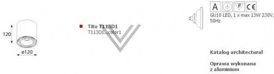 Plafon aluminiowy malowany proszkowo o średnicy 12 cm i wysokości 12 cm do zastosowań wewnętrznych, na 1 żarówkę o mocy maksymalnej 13 WAT, na trzonek GU 10 ES111 i napięcie zasilania 230V, IP20.Kolor oprawy czarny głęboki mat. Zastosowanie: mieszkania, hotele, restauracje itp.Dostępne kolory z wyłączeniem serii: Caspe, Lukomo, Moa, Atego, Bops (tu dostępne forniry)oraz serii Alma i Avatar (tu dostępne barwione drewno)101 Srebrny aluminiowy matowyRAL 9006102 Srebrny aluminiowy połyskRAL 9006113 Biały beskidzki połyskRAL 9016116 Czarny głęboki matowyRAL 9005117 Biały sygnałowy mat strukturaRAL 9003119 Czarny glęboki połyskRAL 9005Poniżej kolory niestandardowe za dopłatą. O wycenę proszę pytać obsługę sklepu.104 Purpurowy czerwony matowyRAL 3004 (dopłata)110 Czerwony karminowy połyskRAL 3002 (dopłata)111 Czerwony karminowy matowyRAL 3002 (dopłata)112 Kremowo beżowy połyskRAL 1015 (dopłata)114 Pomarańczowy średni połyskRAL 2003 (dopłata)115 Niebieski liliowy połyskRAL 4005 (dopłata)118 Grafitowy szary matowyRAL 7024 (dopłata)120 Brązowy szary połyskRAL 8019 (dopłata)121 Niebieski lekki satynaRAL 5012 (dopłata)122 Biały alpejski połyskRAL 9010 (dopłata)123 Kremowy połyskRAL 9001 (dopłata)124 Brązowy czerwony połyskRAL 8012 (dopłata)125 Szary antracytowy połyskRAL 7016 (dopłata)126 Zielony żółty połyskRAL 6018 (dopłata)127 Srebrny ciemny połyskRAL 9007 (dopłata)128 Szary mleczny połyskRAL 7047 (dopłata)129 Niebieski morski połyskRAL 5017 (dopłata)133 Różowy połyskRAL 4010 (dopłata)134 Żółty sygnałowy połyskRAL 1003 (dopłata)135 Niebieski pastelowy połyskRAL 5024 (dopłata)136 Zielony tlenkowy połyskRAL 6020 (dopłata)137 Liliowy ciemny półmatowyRAL 4001 (dopłata)139 Szary bazaltowy połyskRAL 7012 (dopłata)140 Pomarańczowy matowyRAL 2004 (dopłata)141 Różowy intensywny połyskRAL 4003 (dopłata)142 Turkusowy pastelowy połyskRAL 6034 (dopłata)143 Niebieski brylantowy połyskRAL 5007 (dopłata)144 Truskawkowy połyskRAL 3018 (dopłata)145 Oranż matowyRAL 2008 (dopłata)147 Zielony blady połysk 70%RAL 6021 (dopłata)148 Żółty kadmowy połyskRAL 1021 (dopłata)149 Beżowy połyskRAL 1001 (dopłata)151 Żółty jasny połyskRAL 1018 (dopłata)152 Irchowo-szary matowyRAL 1019 (dopłata)153 Beżowy ciemny połyskRAL 1024 (dopłata)154 Żółty sygnałowy połyskRAL 1023 (dopłata)155 Żółty melonowy połyskRAL 1028 (dopłata)156 Żółcień georginiowa połyskRAL 1033 (dopłata)157 Żółty pastelowy połyskRAL 1034 (dopłata)158 Czerwony ceglasty satynaRAL 2002 (dopłata)159 Pomarańczowy połyskRAL 2004 (dopłata)160 Łososiowy połyskRAL 2012 (dopłata)161 Pomarańczowy głęboki (połysk)RAL 2011 (dopłata)162 Rubinowy połyskRAL 3003 (dopłata)163 Czerwień kubańska połyskRAL 3020 (dopłata)164 Buraczkowy połyskRAL 4004 (dopłata)165 Fioletowy sygnałowy połyskRAL 4008 (dopłata)166 Niebieski wrzosowy połyskRAL 5000 (dopłata)167 Ultramaryna połyskRAL 5002 (dopłata)168 Ultramaryna satynaRAL 5002 (dopłata)169 Niebieski Chagall połyskRAL 5010 (dopłata)170 Niebieski lekki połyskRAL 5012 (dopłata)171 Niebieski średni połyskRAL 5015 (dopłata)172 Niebieski średni matowyRAL 5015 (dopłata)173 Zielony szmaragdowy połyskRAL 6001 (dopłata)174 Zielony soczysty pół-połyskRAL 6010 (dopłata)176 Zielony trzcinowy połyskRAL 6013 (dopłata)177 Majowa zieleń połyskRAL 6017 (dopłata)178 Zielony sygnałowy połyskRAL 6024 (dopłata)179 Szary błękitny matowyRAL 7001 (dopłata)180 Szary sygnałowy połyskRAL 7004 (dopłata)181 Szary łupek połyskRAL 7015 (dopłata)182 Szary łupek matowyRAL 7015 (dopłata)183 Szary jasny połyskRAL 7035 (dopłata)184 Szary jedwabisty satynaRAL 7044 (dopłata)185 Szary jedwabisty matowyRAL 7044 (dopłata)186 Szary jedwabisty połyskRAL 7044 (dopłata)188 Brązowy mahoniowy połyskRAL 8016 (dopłata)189 Brązowy grizzly połyskRAL 8017 (dopłata)190 Ziemisty brązowy matowyRAL 8028 (dopłata)191 Biały sygnałowy połyskRAL 9003 (dopłata)192 Biały sygnałowy matowyRAL 9003 (dopłata)193 Czarny sygnałowy matowyRAL 9004 (dopłata)195 Czarny połyskRAL 9017 (dopłata)196 Czarny matowyRAL 9017 (dopłata)251 Różowy jasny połyskRAL 3015 (dopłata)252 Niebieski liliowy matowyRAL 4005 (dopłata)253 Brązowy miodowy połyskRAL 8003 (dopłata)254 Miętowy połyskRAL 6019 (dopłata)