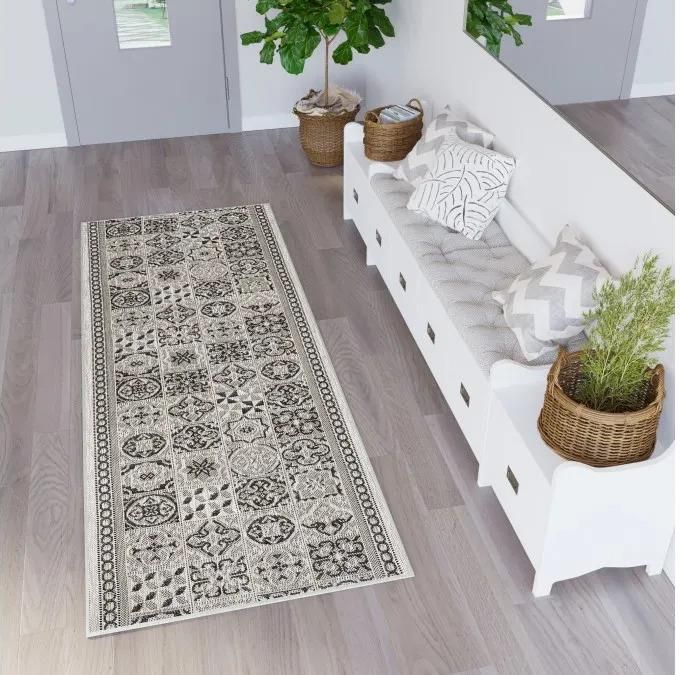 Dywan Chodnik sznurkowy Meli 00.87a gray z kolekcji sznurkowy to prawdziwa perełka dla miłośników eleganckiego i klasycznego wzornictwa. Dominującym kolorem tego dywanu jest szary, który nadaje mu stonowany i uniwersalny charakter, idealny do różnorodnych aranżacji wnętrz. Szary odcień jest łagodny, a zarazem wyrafinowany, co sprawia, że dywan ten może być centralnym punktem pomieszczenia lub subtelnym dopełnieniem istniejącej dekoracji. Oprócz głównego koloru, dywan zdobią dodatkowe barwy, takie jak biel i beż, które w subtelny sposób przeplatają się z szarym tłem, tworząc harmonijną kompozycję. Wzór dywanu jest niezwykle bogaty i złożony, inspirowany tradycyjnymi motywami ornamentalnymi. Centralna część dywanu wypełniona jest geometrycznymi i kwiatowymi wzorami, które układają się w powtarzające się medaliony. Każdy z tych medalionów jest otoczony delikatnymi liniami i kształtami, które dodają dywanowi głębi i dynamiki. Brzegi dywanu zdobią paski i motywy roślinne, które nie tylko ramują całość, ale również dodają dywanowi charakteru i elegancji. Dywan ten nie posiada frędzli, co nadaje mu nowoczesny wygląd, a jednocześnie zachowuje klasyczny urok. Jeśli szukasz inspiracji na urządzenie wnętrza z tym dywanem, wyobraź sobie przestronny salon z wysokimi oknami, przez które wpada naturalne światło. Dywan Chodnik sznurkowy Meli 00.87a gray może leżeć na jasnym drewnianym parkiecie, tworząc kontrast z ciepłym odcieniem podłogi. Ustaw obok niego białą lub szarą sofę z miękkimi poduchami w odcieniach bieli, beżu i szarości, które będą współgrać z kolorystyką dywanu. Dodaj kilka roślin doniczkowych, które wprowadzą do wnętrza odrobinę natury, oraz designerskie lampy z metalowymi akcentami. Taki zestaw stworzy przytulną, ale i elegancką przestrzeń, idealną do relaksu i spotkań z bliskimi. Ten dywan to doskonały wybór dla osób ceniących sobie klasykę z nutą nowoczesności. Jego uniwersalna kolorystyka i bogaty wzór sprawiają, że Chodnik sznurkowy Meli 00.87a gray przypadnie do gustu zarówno minimalistom, jak i miłośnikom bogatego wystroju wnętrz. Zachęcamy do zakupu tego wyjątkowego dywanu, który z pewnością doda Twojemu wnętrzu wyjątkowego charakteru i stylu.