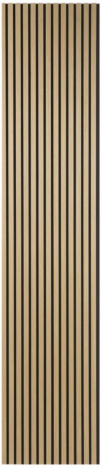 Light Oak marki FibroTech to panel wygłuszający z jasnego dębu do izolacji akustycznej. Składa się z drewnianych listew zamontowanych na dźwiękochłonnej płycie poliestrowej.