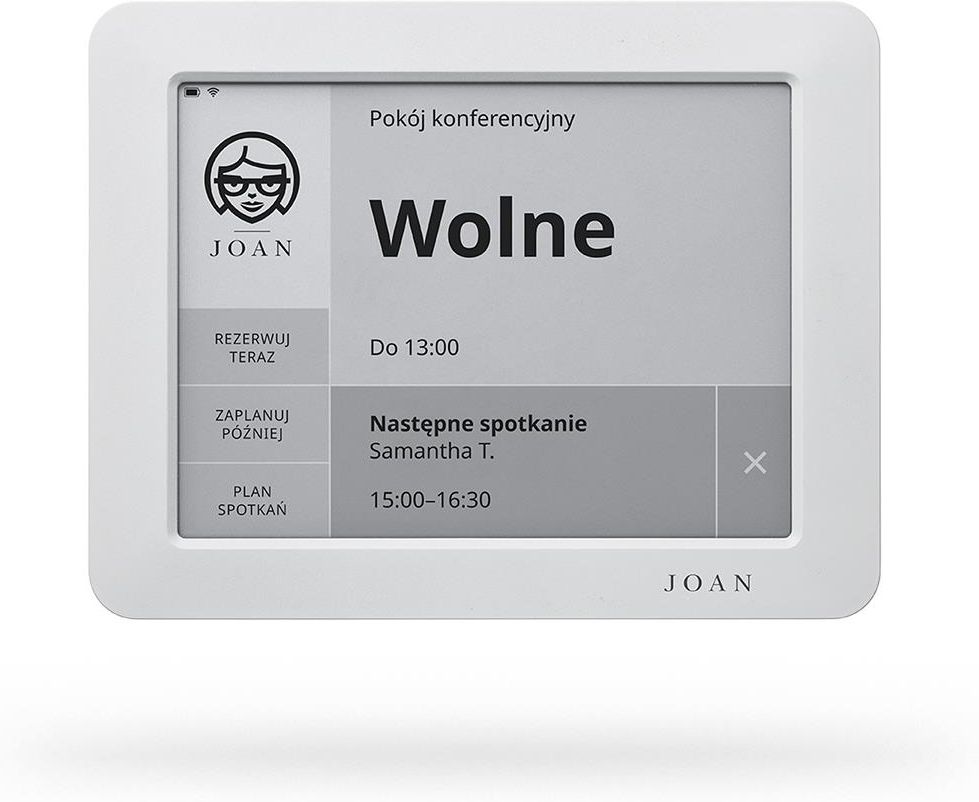 System rezerwacji sal Joan 6 RE Joan to innowacyjne urządzenie do zarządzania rezerwacjami pomieszczeń, które dzięki wbudowanej baterii i obsłudze Wi-Fi jest całkowicie bezprzewodowe, energooszczędne i nie wymaga ingerencji w strukturę ściany przy montażu! Dotykowy wyświetlacz Joan 6 RE wykonany jest w technologii E-Ink (papier elektroniczny) i oprócz charakterystycznego dla tej technologii niskiego zapotrzebowania na energię, wyróżnia się również bardzo dobrą czytelnością (nawet w świetle słonecznym) oraz szerokimi kątami widzenia (180 stopni). Model Joan 6 posiada również podświetlenie ekranu, które dzięki wbudowanemu czujnikowi ruchu, wybudza i oświetla ekran, gdy wykryje w pobliżu osobę. Parametry wyświetlacza E-Ink ® Pearl przekątna 6 rozdzielczość 1024x768 16 odcieni szarości wysoki kontrast niskie zużycie energii pojemnościowa technologia dotyk Urządzenie jest całkowicie bezprzewodowe i nie wymaga stałego zasilania! Dzięki baterii o pojemności 5400 mAh oraz wbudowanemu modułowi Wi-Fi Joan może pracować do 3 miesięcy bez ładowania. Urządzenie wystarczy powiesić na ścianie za pomocą montażu magnesowego. Joan nie wymaga instalacji elektrycznej i LAN. Gdy urządzenia będą wymagały naładowania administrator zostanie poinformowany wiadomością mailową. Urządzenie jest gotowe do pracy od razu po wyjęciu z pudełka. Podczas trwającej kilka minut konfiguracji należy zsynchronizować urządzenie z lokalną siecią Wi-Fi oraz powiązać z kalendarzem sali konferencyjnej za pomocą wygodnego portalu Joan. Innowacyjnie rozwiązany montaż naścienny nie wymaga wiercenia i umożliwia łatwy demontaż urządzenia na potrzeby przemieszczenia lub ładowania urządzenia. Dodatkowo nic nie stoi na przeszkodzie, aby zamontować urządzenie np. na szklanej powierzchni! Rezerwacja sali może odbywać się przy użyciu programu lub kalendarza (np. Outlook) albo bezpośrednio przy dotykowym panelu. Joan umożliwia również podgląd statusu pomieszczeń (stan naładowania baterii, połączenie z siecią, zajętość) za pomocą wygodnego pulpitu dostępnego przez przeglądarkę z dowolnego miejsca z dostępem do internetu! Obsługiwane typy kalendarzy Office 365 Exchange 2010/2013 Google Workspace iCalendar Plany abonamentowe Częścią ekosystemu Joan są również plany abonamentowe w ramach których dostępne są określone funkcje. Zakup planu jest obligatoryjny, urządzenie nie może funkcjonować bez planu taryfowego. Plan Essential będący pierwszym krokiem do skutecznego zarządzania przestrzenią spotkań w biurze dzięki implementacji podstawowych funkcjonalności. Plan Essential zawiera: Ogólne funkcje rezerwacji pokoi Wsparcie językowe Aplikacja mobilna Treść niestandardowa Jednokrotne logowanie (Google, Office 365) Dostęp do API Zarządzanie jedną lokalizacją Plan Professional oferujący rozszerzone opcje, które pomogą zoptymalizować przestrzeń biurową. Na plan Professional składają się: Ogólne funkcje rezerwacji pokoi Wsparcie językowe Aplikacja mobilna Treść niestandardowa Jednokrotne logowanie (Google, Office 365) Dostęp do API Branding (logo niestandardowe) Automatycznie bezpłatne rezerwacje bez opieki (Zameldować się) Integracje (Slack, MS Teams, Webex, Jabra, Logitech, przyciski niestandardowe) Zarządzaniem do 3 lokalizacji Plan Enterprise na pokładzie pełna możliwość personalizacji oraz wszystkie dostępne funkcje planów Essential i Professional. Nieograniczone zarządzanie wieloma lokalizacjami Integracja z Active Directory/SCIM (Azure AD, Okta, OneLogin) Dedykowany agent wsparcia Wymiary urządzenia - 155.82 x 120.4 x 12,4 mm Komunikacja: Komunikacja: 2.4/5 GHz Wi-Fi (IEEE 802.11 b/g/n) standard, wparcie WPA2-PSK, wsparcie WPA2-EAP, wsparcie WPA3-P, wsparcie dla 2.4 GHz Bluetooth 5 Standardowa gwarancja: 12 miesięcy