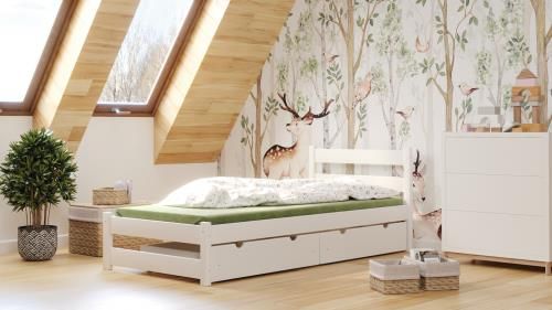 Łóżko TESSA wykonujemy zgodnie z zasadą "ZERO WASTE" Łóżko wykonane jest ze specjalnego materiału konstrukcyjnego uzyskanego z połączenia drewna sosnowego, płyt HDF i MDF. Tego typu konstrukcja pozwoliła osiągnąć wysokie parametry wytrzymałościowe oraz estetyczne. WŁAŚCIWOŚCI: łóżko występuje wyłącznie w kolorze białym wykonane zostało zgodnie z zasadą "ZERO WASTE" łóżko wykonane jest ze specjalnego materiału konstrukcyjnego uzyskanego z połączenia drewna sosnowego, płyt HDF i MDF. elementy łóżka cechują się bardzo gładką strukturą i zaokrąglonymi krawędziami. dostępne w dwóch wymiarach 200x90 i 190x80 udźwig na stelażu 90 kg zaokrąglone krawędzie łóżka posiada certyfikat FSC nie ma możliwości montażu barierki zabezpieczającej ZESTAW ZAWIERA: konstrukcję łóżka stelaż pod materac komplety śrub montażowych instrukcje obsługi OPCJE DODATKOWE DO ŁÓŻKA: 1. SZUFLADA szuflada na kółkach gumowych (w kolorze łóżka) szuflada podwójna na kółkach gumowych (w kolorze łóżka) wzmacniana szuflada na kółkach gumowych - DODATKOWE SPANIE /pod materac 150x80/ (w kolorze łóżka) PARAMETRY SZUFLADY Z FUNKCJĄ SPANIA: Wysokość frontu: 19 cmWysokość boków i tyłu: 12 cmPasuje do łóżek z prześwitem na szufladę minimum 21 cm Długość frontu: Zależna od wymiaru łóżka:Długość łóżka pod materac 160 cm – długość frontu szuflady wynosi 159,5 cmDługość łóżka pod materac 180 cm – długość frontu szuflady wynosi 179,5 cmDługość łóżka pod materac 190 cm – długość frontu szuflady wynosi 189,5 cmDługość łóżka pod materac 200 cm – długość frontu szuflady wynosi 199,5 cm Wymiar materaca do szuflady:Wymiar łóżka 160×80 – 150×80 cmWymiar łóżka 180×80 – 170×80 cmWymiar łóżka 180×90 – 170×90 cmWymiar łóżka 190×80 – 180×80 cmWymiar łóżka 190×90 – 180×90 cmWymiar łóżka 200×90 – 190×90 cm MATERIACE: PIANKA Wkład materaca stanowi pianka poliuretanowa posiadająca dobre właściwości przepuszczania powietrza, komfortowai bezpieczna dla dzieci. Pokrowiec z tkaniny typu Jersey, zapinany na zamek błyskawiczny można bezpiecznie wyprać w temperaturze 40°C, Najważniejsze cechy materaca: grubość 8 cm materac dwustronny dobre właściwości przepuszczania powietrza pianka poliuretanowa , dobrze podpiera ciało, zapewniając jego optymalne ułożenie PIANKA-KOKOS Materac PIANKA-KOKOS to ekologiczny produkt wyposażony w dodatkową warstwę kokosa. Dzięki jej zastosowaniu zapobiegamy rozwojowi roztoczy. To czyni go idealnym wyborem dla alergików. Materac jest jednostronnie utwardzony dlatego też nie zaleca się jego odwracania. Do materaca dołączony jest pokrowiec z zamkiem błyskawicznym. Zarówno materac jak i pokrowiec możemy prać w 40 stopniach Celsjusza. Najważniejsze cechy materaca: wysokość 9 cm, dodatkowa warstwa kokosa, pokrowiec z zamkiem błyskawicznym, właściwości ortopedyczne, zapewniona cyrkulacja powietrza, odpowiedni dla alergików, bardzo wytrzymały i odporny na odkształcenia, możliwość prania w 40 st. GRYKA-KOKOS-PIANKA Materac GRYKA-KOKOS-PIANKA to tak naprawdę Król. Król wśród materacy. Jako jeden z niewielu materacy na rynku wyposażony jest w dodatkową warstwę kokosa i gryki. Taka kombinacja wkładu zapewnia wysoki komfort użytkowania. Materac nie pochłania kurzu i wilgoci, posiada właściwości antyalergiczne i antygrzybicze. Można go prać w 40 stopniach. W zestawie dołączony jest trwały pokrowiec z zamkiem błyskawicznym. Posiada atest Polskiego Zakładu Higieny. Najważniejsze cechy materaca: grubość 10 cm, dodatkowa warstwa kokosa, dodatkowa warstwa gryki, pokrowiec z zamkiem błyskawicznym, atest PZH, właściwości ortopedyczne, zapewniona cyrkulacja powietrza, właściwości antyalergiczne i antygrzybicze, bardzo wytrzymały i odporny na odkształcenia, możliwość prania w 40 st. MATERIAŁ drewno sosnowe malowane farbą wodno-rozcieńczalną MONTAŻ: meble dostarczane są w paczkach z instrukcją do samodzielnego montażu. WYMIARY: długość zewnętrzna - do szer i długości należy dodać + 5 cm odnośnie wielkości materaca. szerokość całkowita 85 cm grubość deski 22 mm długość barierki : 100cm