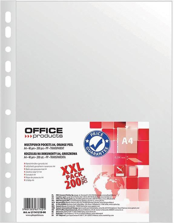 KOSZULKI NA DOKUMENTY OFFICE PRODUCTS, PP, A4, GROSZKOWE, 40MIKR., 200SZT. ekonomiczne, wykonane z miękkiej folii polipropylenowej o grubości 40μm posiada właściwości antyrefleksyjne groszkowe, transparentne wzmocniony brzeg rozcięte na górze antyelektrostatyczne i antyrefleksyjne do zastosowania …