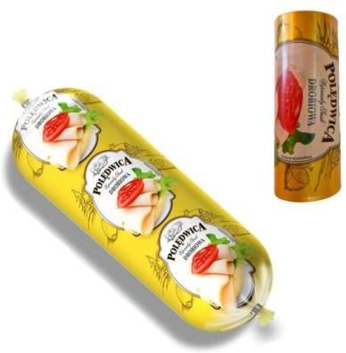 Osłonka Termokurczliwa Barierowa na Polędwicę Drobiową Osłonka Termokurczliwa fi 75 / 115 mm SPECYFIKACJA: Opakowanie: 10m Szerokość rękawa - złożonego/ "na płasko": 115 mm Kaliber/średnica po napełnieniu: fi 75 mm Nadruk: "Polędwica drobiowa" Kolor osłonki: żółto-złota ZASTOSOWANIE Do wyrobu polędwicy drobiowej Osłonki barierowe można stosować w zakresie temperatur od -18°C do +121°C. Podczas procesu schładzania osłonka wraz z farszem obkurcza się, dlatego sprawdza się również jako zamiennik do szynkowarów. CECHY PRODUKTU: Osłonki poliamidowe do wędlin są wielowarstwowe, z wewnętrzną warstwą z poliamidu, idealnie kompatybilną z farszem mięsnym. Zapobiega to rozdzielaniu się składników podczas produkcji. Stosuje się je przy wyrobach wędliniarskich, garmażeryjnych, szybkach gotowanych i produktach z drobiu. W procesie parzenia kurczą się o 15%, zachowując gładkość i świeży aromat wędlin. Dzięki pięciu warstwom, osłonki są bardzo skuteczne w zabezpieczaniu wędlin przed wilgocią, gazami oraz utrzymaniu ich świeżości i aromatu przez trzy miesiące. Batony w takich osłonkach są równomierne, gładkie i nie marszczą się.