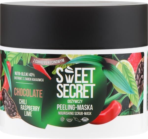 ODŻYWCZY PEELING-MASKA DO CIAŁA Z CUKREM TRZCINOWYM CZEKOLADA Z CHILI I OWOCAMI 200g Sweet Secret. Twoja słodka tajemnica. Nieopisana słodycz, której nie musisz sobie odmawiać. Chwile zapomnienia, które mogą trwać bez końca. Wyobraź sobie dzień pachnący jak czekolada z chili i owocami. A przy tym Twoje ciało otrzymuje wszystko, czego potrzebuje. Odżywczy peeling-maska do ciałą Sweet Secret, bogaty w nutrii-olejki, delikatnie natłuszcza i pielęgnuje skórę. Ekstrakt z ziaren kakaowca intensywnie odżywia, ekstrakt z limonki i olej malinowy wygładzają i poprawiają elastyczność, a kryształki cukru trzcinowego usuwają martwe komórki naskórka, dzięki czemu ciało staje się zachwycająco miękkie, delikatne i jedwabiście gładkie. Tak, Sweet Secret to nie tylko przyjemność. To Twoja słodka tajemnica piękna. EFEKTY: delikatnie natłuszcza i pielęgnuje skórę, odżywia i łagodzi podrażnienia, doskonale wygładza.