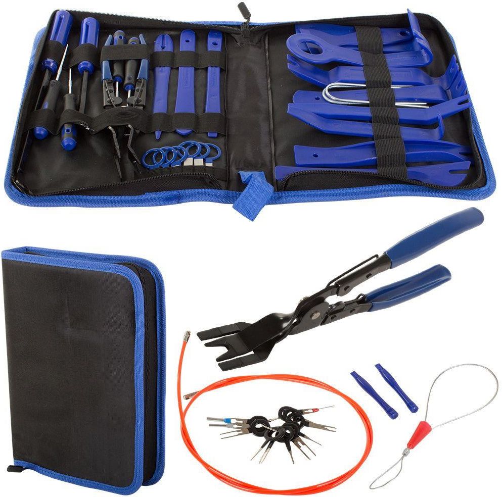 SZCZYPCE ŚCIĄGACZE TAPICERKI WYJMAKI SPINEK RADIA Specjalistyczne ściągacze do demontażu tapicerki, spinek i listew samochodowych. Przydają się również przy wyjmowaniu radia samochodowe, licznika, sprzętu elektronicznego na zatrzaski. Otwieraki wykoanane z mocnego tworzywa, dzięki nim nie wyszczerbisz rantów tapicerki podczas jej podważania. Zaletą ściągaczy jest nie zostawianie trwałych zarysowań i uszkodzeń tapicerki, co ma wpływ na zachowanie estetyki wnętrza samochodu. Zestaw polecany do prac w serwisach samochodowych, tapicerskich, blacharskich i lakierniczych. SPECYFIKACJA TECHNICZNA: ✅ Kod produktu: 11307 ✅ Wysoka jakość wykonania ✅ Uniwersalne ✅ Szerokie zastosowanie ✅ Proste w obsłudze ✅ Kolor: niebieski ZESTAW ZAWIERA: ☑️ 11 x łyżki plastikowe ☑️ 1 x szczypce do demontażu kołków spinek ☑️ 2 x łom do spinek ☑️ 6 x wyjmaki do radia, nawigacji ☑️ 11 x wyjmaki do pinów z kostek elektrycznych ☑️ 1 x szpachelka ☑️ 4 x śrubokręty, szpikulce do uszczelek oringów, itp. ☑️ 1 x pokrowiec / organizer.