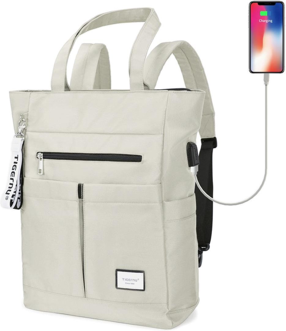 Torba/Plecak Tigernu T-S8632 na laptopa 15" pojemny worek ----------------------------------------------------------- Dostępność: Wys. w 24h Kolor: beżowy ----------------------------------------------------------- Wymiary zewnętrzne: 41 x 28 x 13 cm Waga: 0,66 kg Pojemność: 15 l Maksymalny rozmiar laptopa: 36 x 26 x 2,5 cm Zmierz swojego laptopa ------------------------------------------------------------------------ Chcesz mieć pewność, ze produkt będzie pasował na twojego laptopa? Przed zakupem zmierz go i porównaj jego wymiary z wymiarami podanymi poniżej. Maksymalny rozmiar laptopa: 36 x 26 x 2,5 cm Opis produktu ------------------------------------------------------------------------ Stylowa torba/plecak marki Tigernu o symbolu T-S8632 jest lekka i pojemna, pomieści wszystkie potrzebne rzeczy oraz laptopa. Torba została wykonana z wytrzymałego i wodoodpornego materiału - nylonu. W głównej komorze znajduje się miękka kieszeń na laptop w rozmiarze do 15", która jest wyłożona antywstrząsowymi wypustkami zapewniającymi amortyzację i bezpieczeństwo przenoszonego sprzętu. Ponadto wewnątrz torby znajdują się tu dwie kieszonki po bokach oraz trzecia kieszeń zapinana na zamek. Komora zapinana jest na zamek. Z przodu plecaka znajdują się trzy kieszenie na podręczne rzeczy, w tym jedna również zapinana na zamek. Po bokach plecaka umieszczono elastyczne kieszenie na parasolkę lub napój. Z lewej strony torba posiada zewnętrzne gniazdo USB, dzięki czemu nie ma konieczności wyciągania power banka z plecaka, aby naładować telefon lub inne przenośne urządzenie. Torba posiada dwa dłuższe uchwyty, dzięki czemu można wygodnie nosić ją na ramieniu, oraz odpinane szelki umożliwiające założenie torby na plecy jak plecak. Do torby dołączono dwie czarno-białe smycze z logiem producenta, które mogą służyć jako ozdoba plecaka lub można je przypiąć do kluczy i używać oddzielnie. Torba Tigernu T-S8632 to pojemna, wygodna i nowoczesna torba/plecak w stylu worka, która na pewno przypadnie do gustu niejednej kobiecie. Wytrzymały nylon ------------------------------------------------------------------------ Plecak wykonany jest z wytrzymałego, impregnowanego materiału, co sprawia, że jest nie tylko trwały, ale i wodoodporny. Miękka komora na laptopa ------------------------------------------------------------------------ Torba posiada komorę na laptopa wyłożoną w całości specjalnym materiałem z wypustkami. Dzięki takiemu rozwiązaniu, laptop jest chroniony ze wszystkich stron i nawet w przypadku upuszczenia torby lub uderzenia jej o coś, komputer będzie bezpieczny. Komora na laptopa zapinana jest na rzep. Dwie możliwości noszenia ------------------------------------------------------------------------ Torba można nosić zarówno na ramieniu jak i na plecach. Szelki można schować do tylnej kieszeni, a ich montaż i demontaż jest bardzo prosty. Złącze USB ------------------------------------------------------------------------ Plecak wyposażony jest w gniazdo USB, dzięki czemu nie ma konieczności wyciągania power banka z plecaka, aby naładować telefon. Uwaga, power bank nie jest częścią zestawu. Galeria produktu Tigernu Torba/Plecak Tigernu T-S8632 na laptopa 15" pojemny worek ------------------------------------------------------------------------