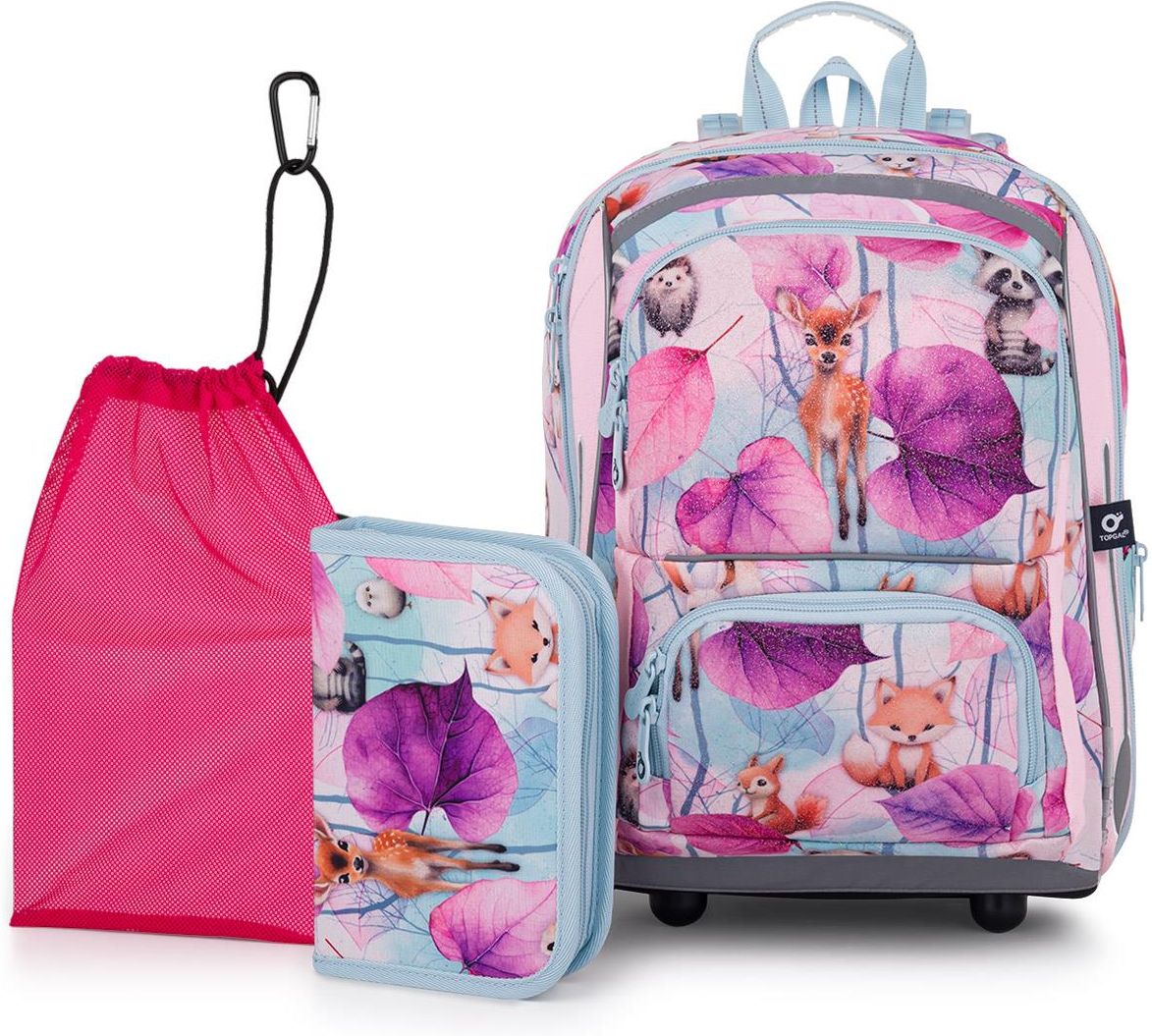 Zestaw szkolny składający się z plecaka, piórnika i worka. Komplet szkolny składa się z produktów: BEBE 25002 - Tornister szkolny leśne zwierzątka, PENN 25002 - Piórnik szkolny z dwoma skrzydłami, ZUZA 19045 - Worek na obuwie