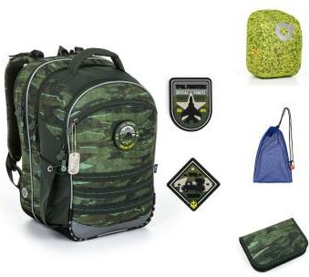 Zestaw do szkoły składający się z plecaka, piórnika, worka i pelerynki na plecak Komplet szkolny składa się z produktów: COCO 23040 - Plecak szkolny moro, PENN 23040 - Piórnik szkolny z dwoma skrzydłami, ZUZA 19046 - Worek na obuwie, ZIGI 17001 - Peleryna na plecak