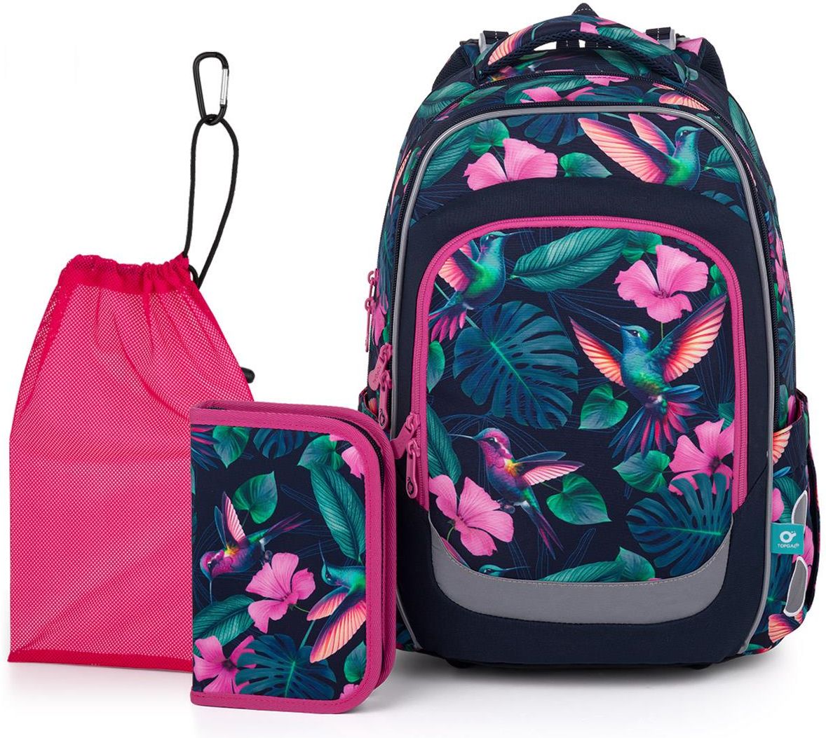 Zestaw szkolny składający się z plecaka, piórnika i worka. Komplet szkolny składa się z produktów: LORI 25008 - Plecak szkolny w ptaki, PENN 25008 - Piórnik szkolny z dwoma skrzydłami, ZUZA 19045 - Worek na obuwie