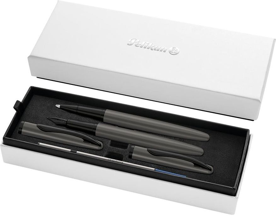 ZESTAW PELIKAN JAZZ NOBLE ELEGANCE PIÓRO WIECZNE I KULKOWE Elegancki zestaw piśmienniczy Pelikan Jazz Noble Elegance to połączenie klasycznego stylu, funkcjonalności i nowoczesnej formy. Dzięki starannemu wykonaniu, ergonomicznemu kształtowi i znakomitemu wyważeniu, zestaw zapewnia wyjątkowy komfort pisania. Idealny jako prezent, wyróżnienie firmowe lub stylowy dodatek do biura. Atrybuty zestawu Pelikan Jazz Noble Elegance stone : Spójny, elegancki design w odcieniu perłowoszarym Pióro wieczne ze stalówką M (stal nierdzewna z końcówką Iridium) Pióro kulkowe (roller) na wymienne wkłady – wygodne i bezproblemowe pisanie Oba przybory zamykane na skuwkę typu „klik” Sprężynowy klips w kształcie dziobu pelikana Wysoka jakość materiałów i znakomite wyważenie Możliwość personalizacji i grawerowania Zapakowane w eleganckie kartonowe etui Metalowe elementy nadające się do recyklingu – ekologiczny wybór Dane techniczne – pióro wieczne i roller: System napełniania: – Pióro wieczne: naboje atramentowe (1 długi lub 2 krótkie, w zestawie nabój niebieski) – Roller: wkład do rollera (wymienny) Materiał korpusu i skuwki: mosiądz lakierowany Kolor: perłowy ciemnoszary (korpus i skuwka) Wykończenia: w czarnym błyszczącym kolorze Klip: elastyczny, metalowy, w kształcie dziobu pelikana Zamknięcie: skuwka „na klik” (w obu przyborach) Wymiary: – Długość: 140 mm – Średnica: 8–9 mm – Waga: pióro wieczne – 24 g, roller – 28 g Kolory i wykończenia: szary/czarny Rodzaj napełnienia: naboje Szlachetność stalówki: stal